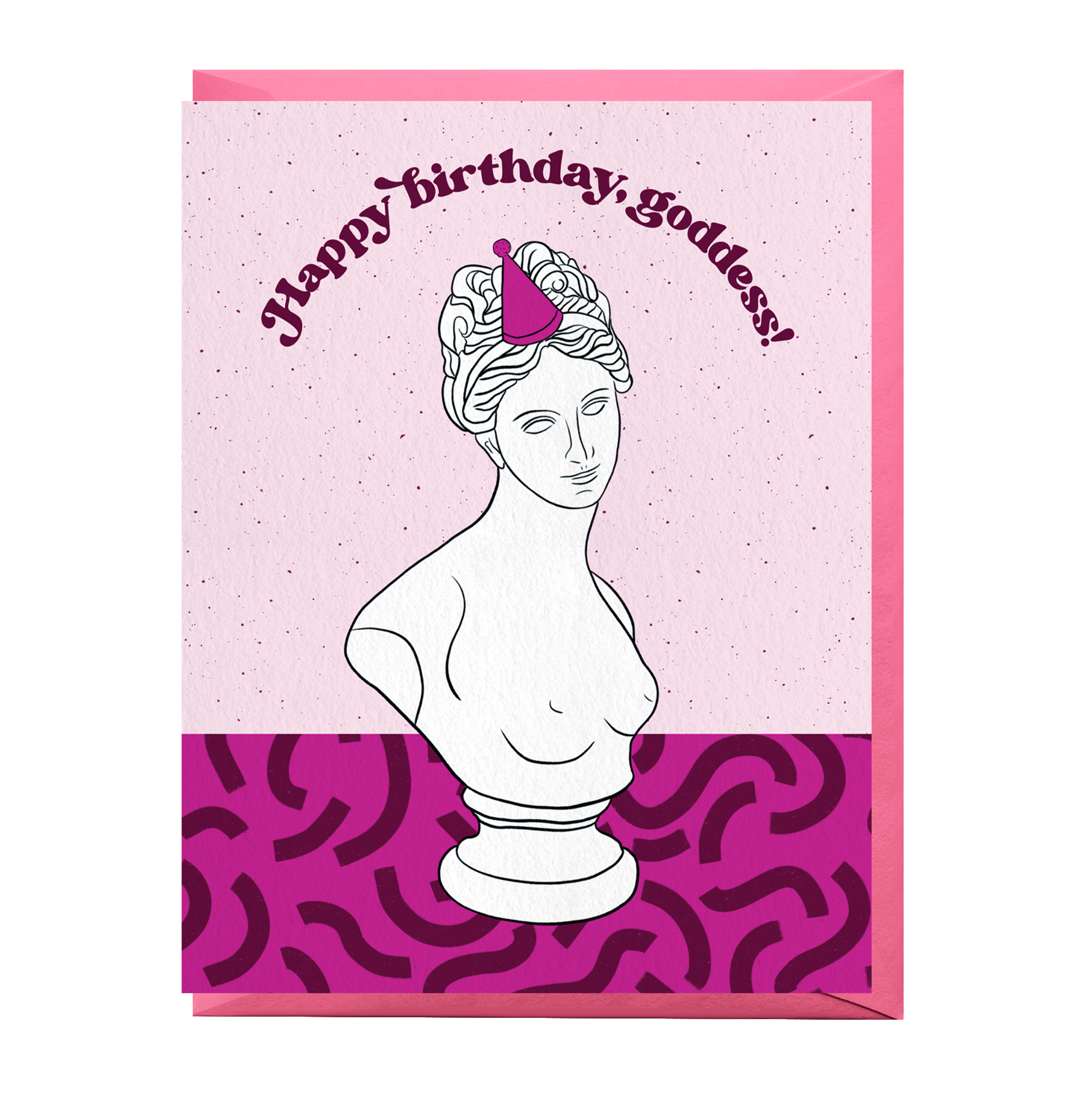 Celebrate your favorite art lover's birthday with this Greek goddess sculpture card. Printed on 100% recycled paper and paired with a coordinating envelope. Blank inside and sealed in a protective cellophane sleeve. Size A2 (4.25" x 5.5"). Card reads "Happy birthday, goddess!" and features an illustrated bust of a Greek goddess wearing a pink birthday hat.