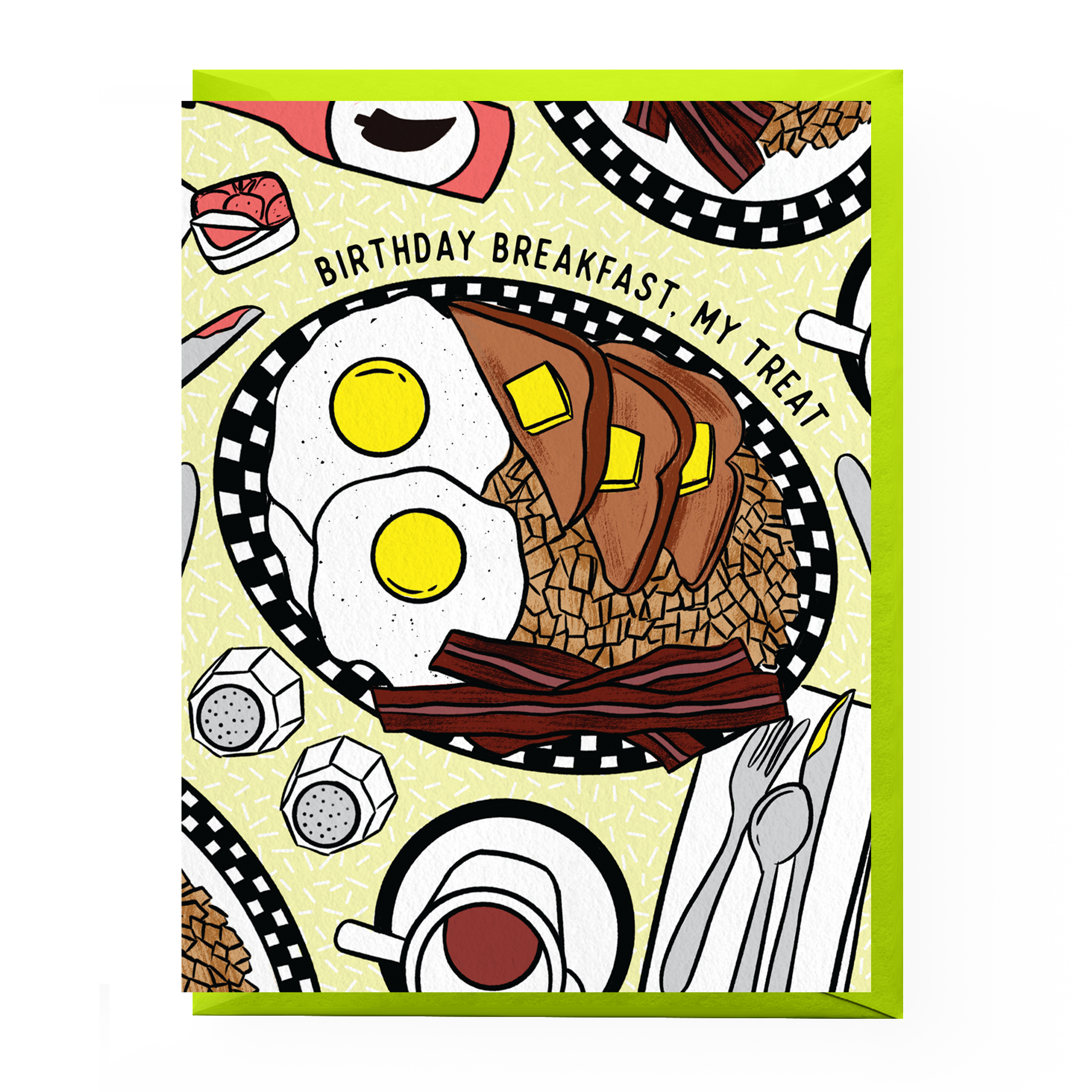 The perfect card for birthday breakfasts, brunches and morning after celebrations. Printed on 100% recycled paper and paired with a coordinating envelope. Blank inside and sealed in a protective cellophane sleeve. Size A2 (4.25" x 5.5"). Card reads "Birthday breakfast, my treat!" and features an illustrated diner breakfast scene with fried eggs, toast, bacon, potatoes, coffee, and hot sauce.