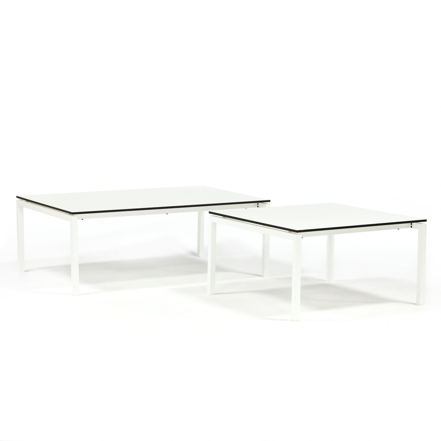 20th Century, square side table and one rectangular coffee table, marked to underside, each with matching white painted wood top with dark umber profile, on a painted white metal frame.
