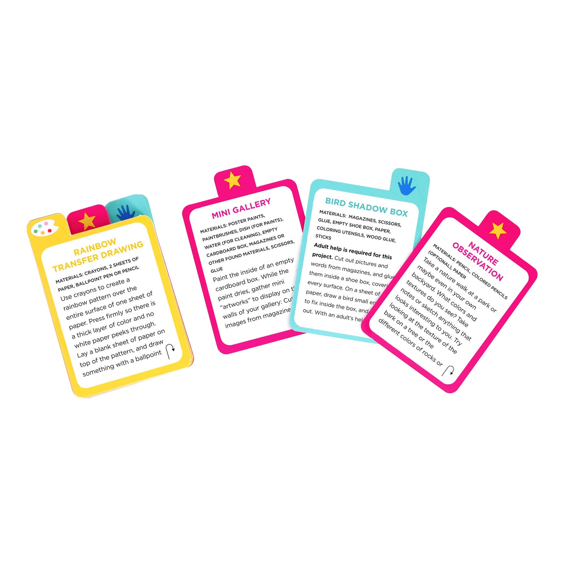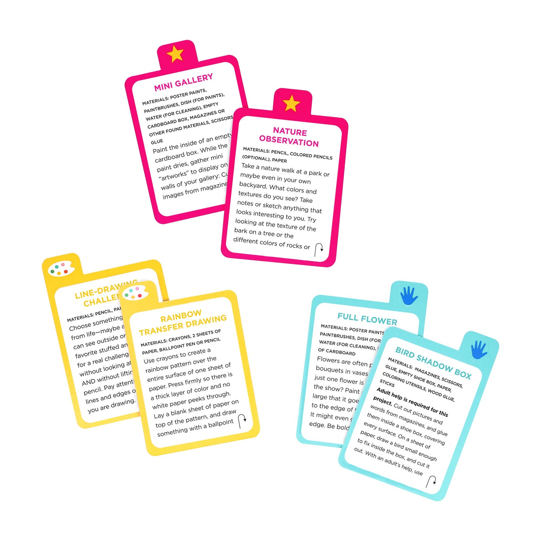Need some ideas to brighten up kids' days, spark creativity and imagination, or get them up and active and away from screens? Pick a card from Busy Ideas for Bored Kids: Artist Edition! From everyday objects and speedy sketches to triptychs and shape-scapes, this pack includes 50 fun ideas to inspire play that will keep boredom at bay. You'll find crafts that kids can achieve independently as well as activities you can do together, so there's something for every scenario. How about creating a blob painting? Or giving surrealism a try? Maybe make a foil sculpture? You can even go on an art hunt around your town! Choose cards with the palette icon if you're feeling playful, the star icon if you want to be inspired, or the hand icon if you're in the mood to make.