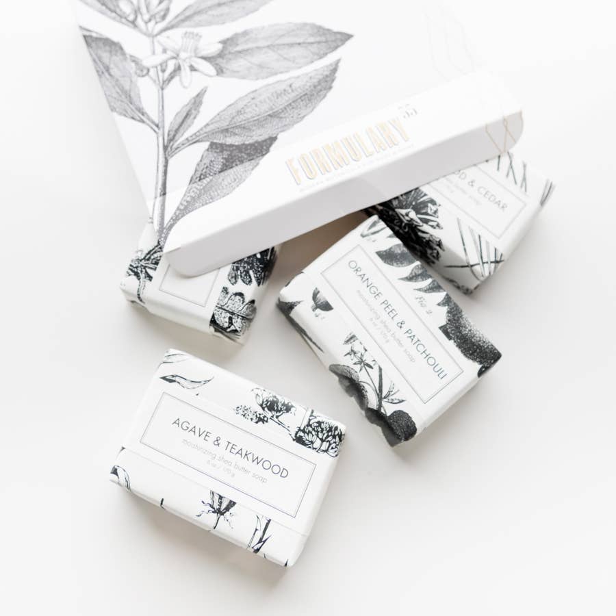 This combo is perfect for the soap connoisseur who prefers more masculine, earthy, and woodsy scents. This beautifully designed boxed set includes one of each of the following Shea Butter Bath Bars: Sandalwood & Cedar – A mix of floral, balsamic, soft and sweet accents that is both earthy and sophisticated. Orange Peel & Patchouli – Bright citrusy notes mixed with earthy essential oils. Agave & Teakwood – A blend of seamoss, bark, cedar, teakwood, agave, aloe, and sweet melon. Fern & Moss - Herbaceous and woodsy mix of leaves, amber, earth, and violets. INGREDIENTS: Our handcrafted soap is made in small batches of saponified oils of coconut, RSPO-certified palm, and shea butter. Scented with our own proprietary blend of phthalate free fragrance oils and essential oils. Formulary 55 products are made in the USA, vegan, cruelty-free, SLS-free, and paraben free.