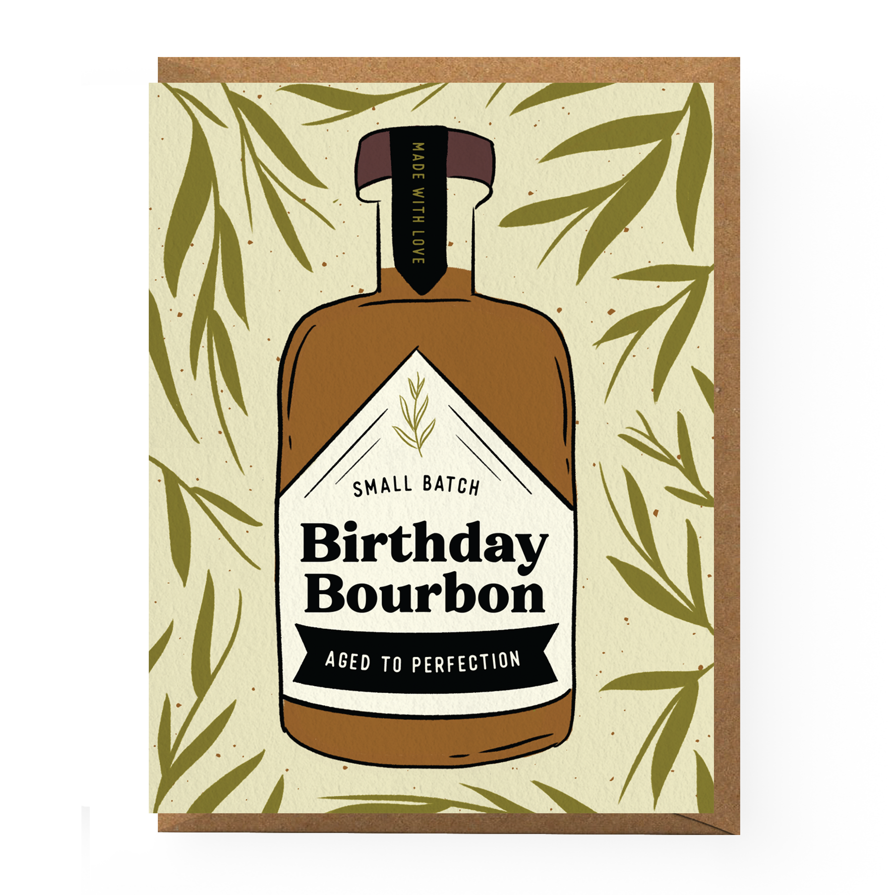 Toast your favorite whiskey drinker's birthday with this small-batch greeting card. Printed on 100% recycled paper and paired with a coordinating envelope. Blank inside and sealed in a protective cellophane sleeve. Size A2 (4.25" x 5.5"). Card reads "Small batch birthday bourbon / aged to perfection" and features an illustrated whiskey bottle surrounded by greenery.