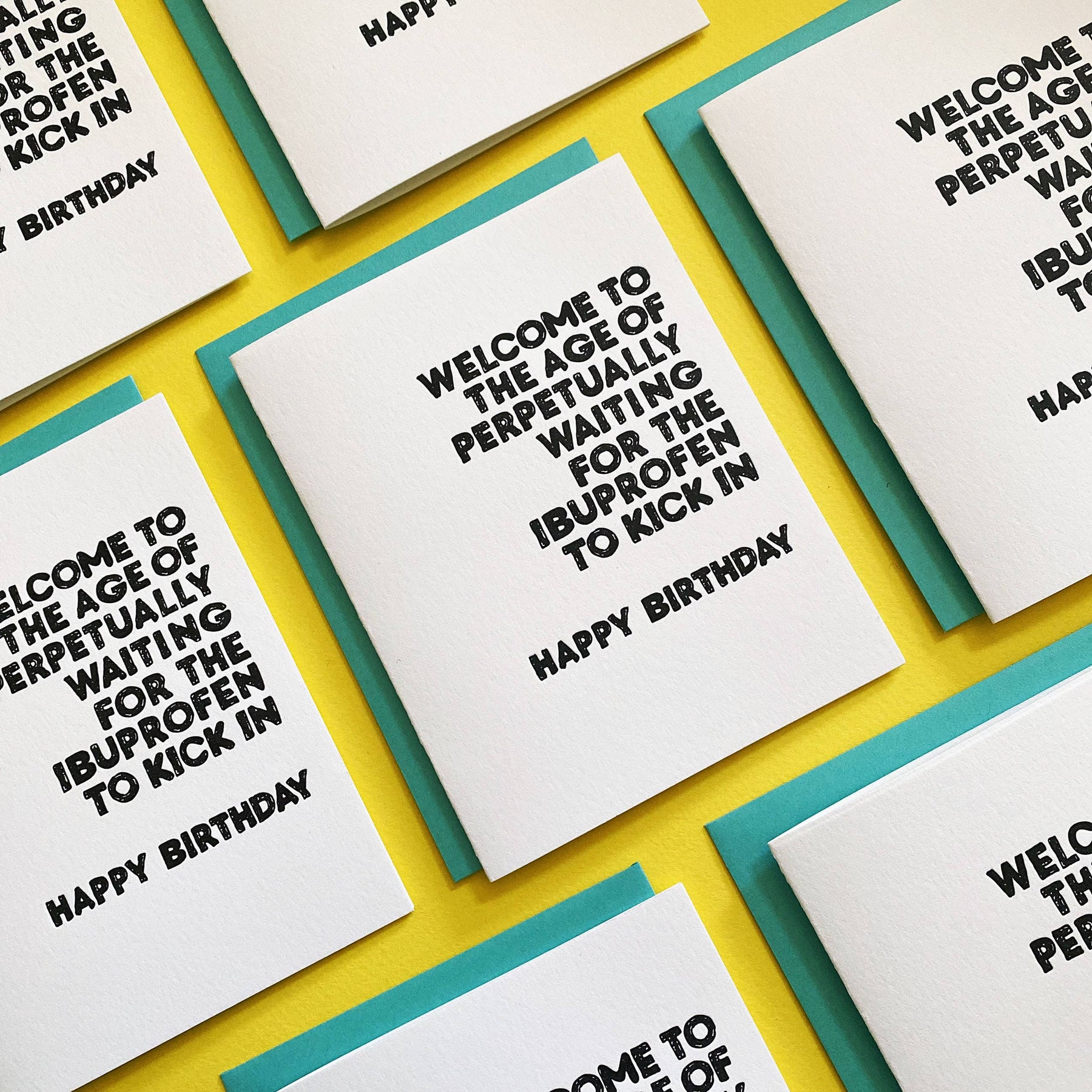 Welcome to the age of perpetually waiting for the Ibuprofen to kick in - Birthday Card The perfect birthday card for anyone over the age of 35. When you know, you know. Letterpressed on luxe Crane's Lettra paper. Hand printed on our Vandercook Press in Long Beach, CA A2 size 5.5" x 4.25" letterpressed birthday card, hand printed, over 30 birthday, For him, For her, Over the Hill, 40th birthday, funny greeting card, hilarious card