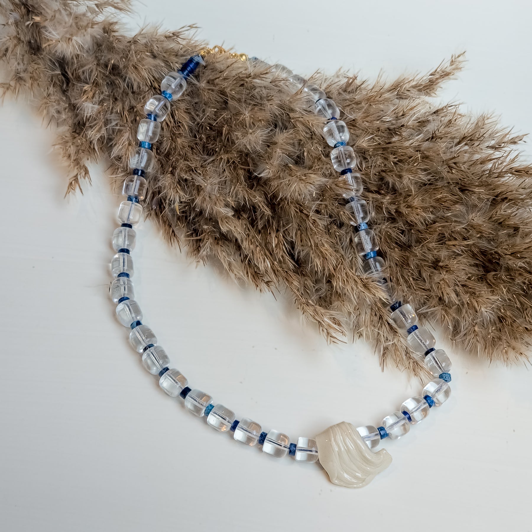 Glass & Blue Vintage Bead Necklace w/ Shell Charm