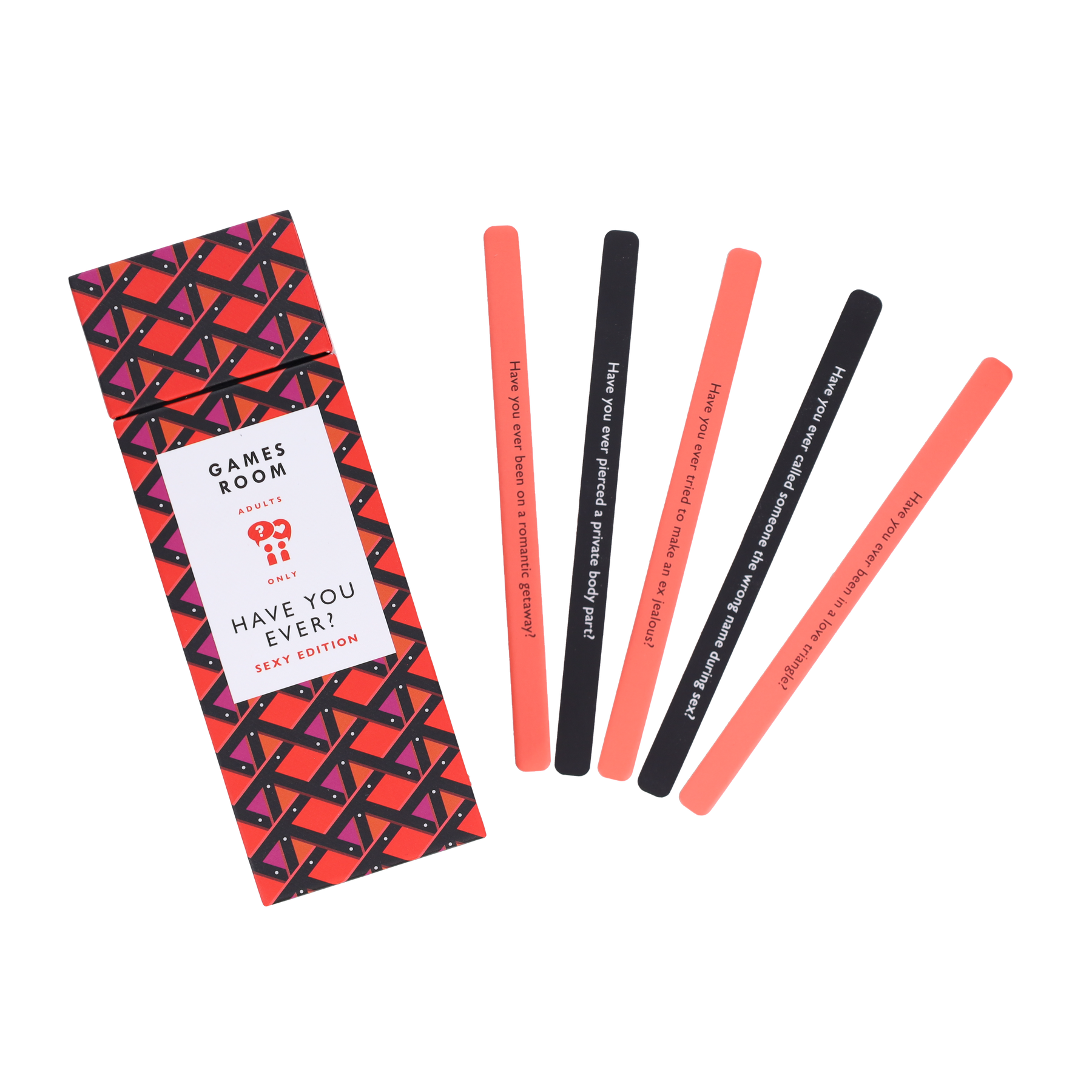Uncover memories and spill saucy secrets with your friends, fellow partygoers, and potential love interests with this entertaining game designed for ages 18 and up! With 100 “have you ever” questions on 50 double-sided sticks, these conversation starters range from benign to risqué. One side of the stick includes sweet, romantic, and funny questions, such as: Have you ever kissed in the rain? Gone commando in public? Been on a terrible first date? The other side includes spicier questions for those willing to be a bit more risqué! Have you ever had sex in the shower? Posed nude? Hooked up with a stranger? Packaged in a handy portable box, this is a great game to bring along to parties or game nights with your adult friends or to spice up date night.