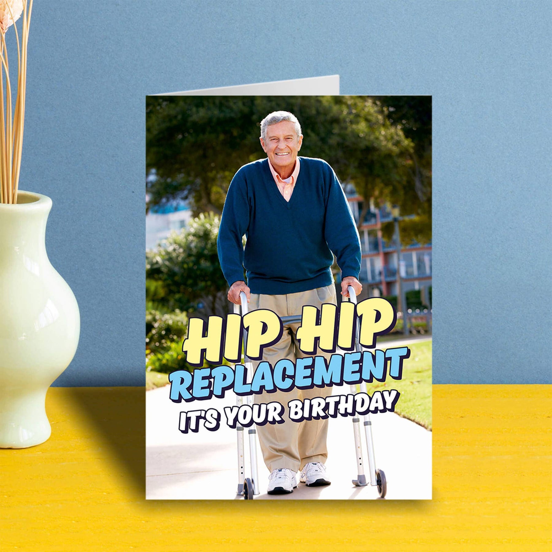 Old age creeps up on all of us, just make sure this Birthday no one ends up dancing on tables or a hip replacement might be an extra present they weren't expecting. A birthday card with a picture of a smiling old man using a walking frame. Blue, yellow and white text in front reads Hip hip replacement it's your birthday.