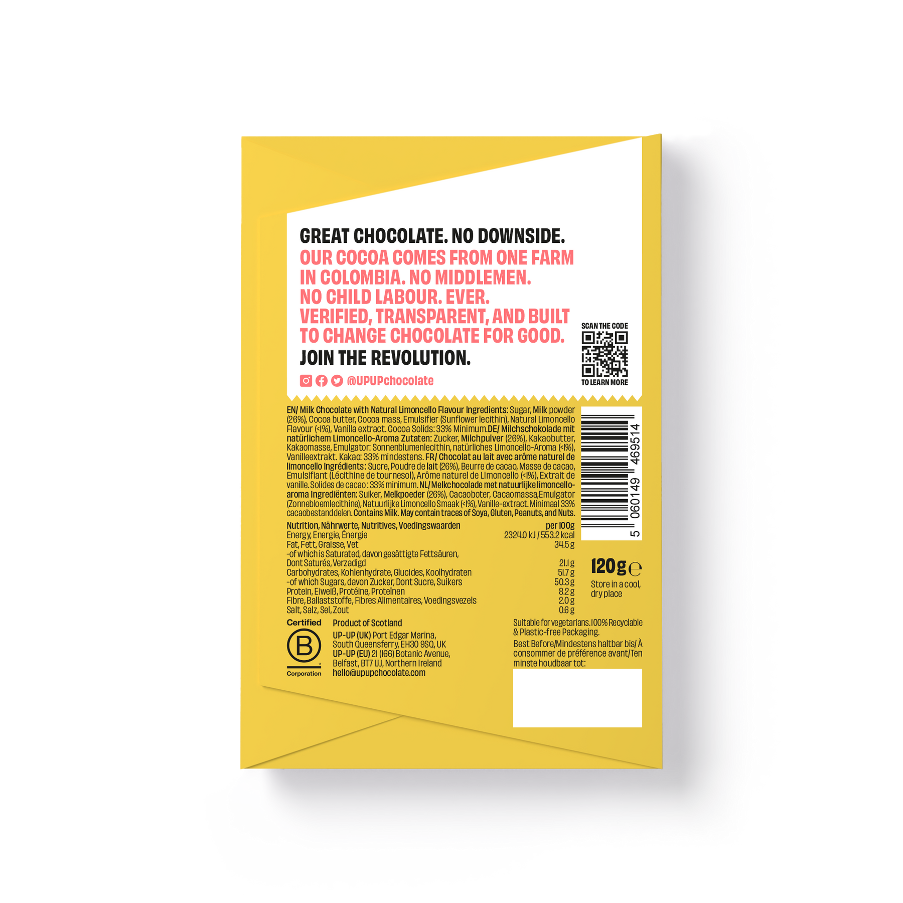 UP-UP Limoncello Chocolate is inspired by Italy’s beloved liqueur. Crafted with Single Estate 35% cacao from fine flavour cocoa beans grown at the renowned "El Rosario" farm in Colombia’s Necoclí region, this bar is infused with the vibrant zest of limoncello flavour. The result is a delightful blend of creamy sweetness and refreshing citrus notes, offering a perfectly balanced and taste of sunshine in every bite. Ingredients: Sugar, milk powder (26%), cocoa butter, cocoa mass, emulsifier: sunflower lecithin, Natural Limoncello Flavour (<1%), vanilla extract. Allergens: Contains Milk. May contain: soya, gluten, peanuts and nuts.