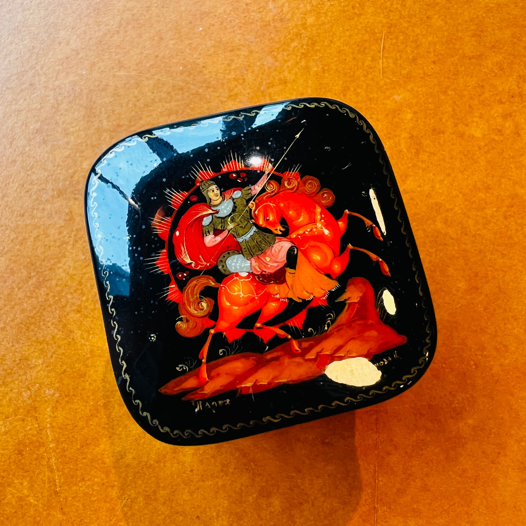 Elevate your jewelry storage with this exquisite vintage lacquer ring box, a functional work of art. Hand-painted with an intricate scene of a horseman rendered in fine detail, the glossy black exterior showcases masterful craftsmanship from a bygone era. The sumptuous red interior provides a luxurious backdrop for your most treasured rings. Perfect for collectors of Asian antiques or anyone seeking a refined accent piece that marries beauty with purpose.