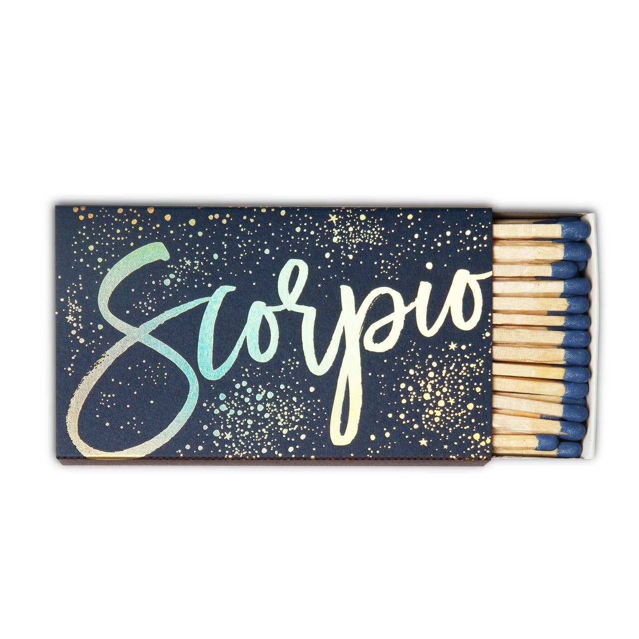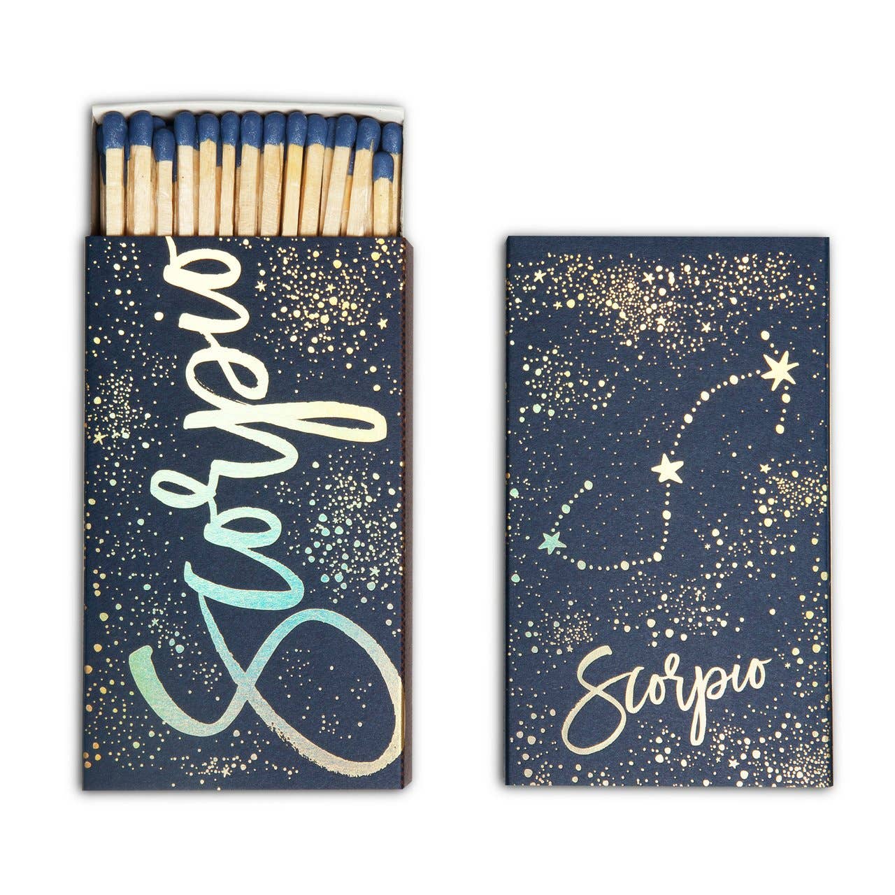 Scorpio - October 23 to November 21. Front/Back: "Scorpio". Printing: Gold Hologram Foil, Navy Stock. Matchbox size: 4.5" x 2.5" x .75". 60 matches tipped in Dark Blue.