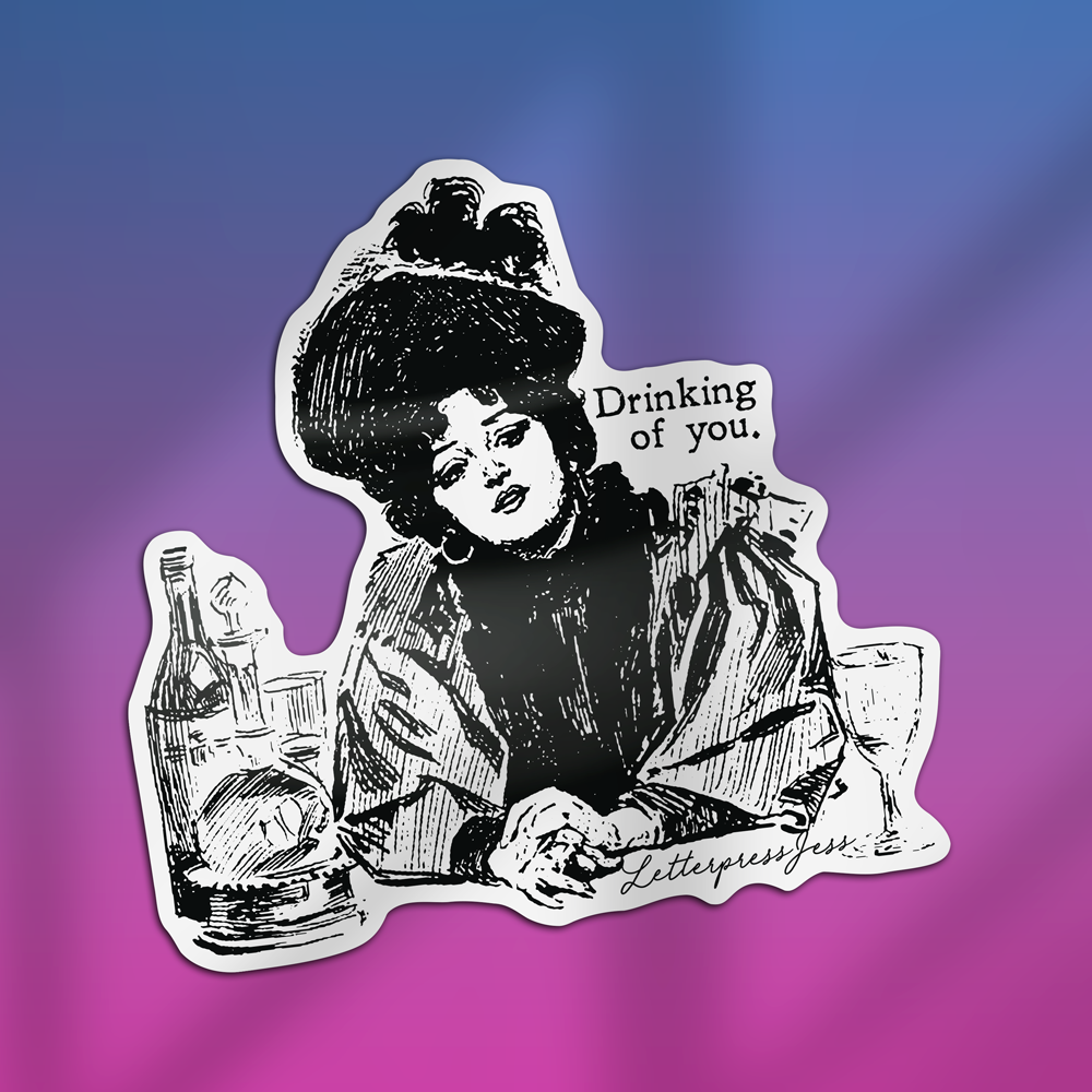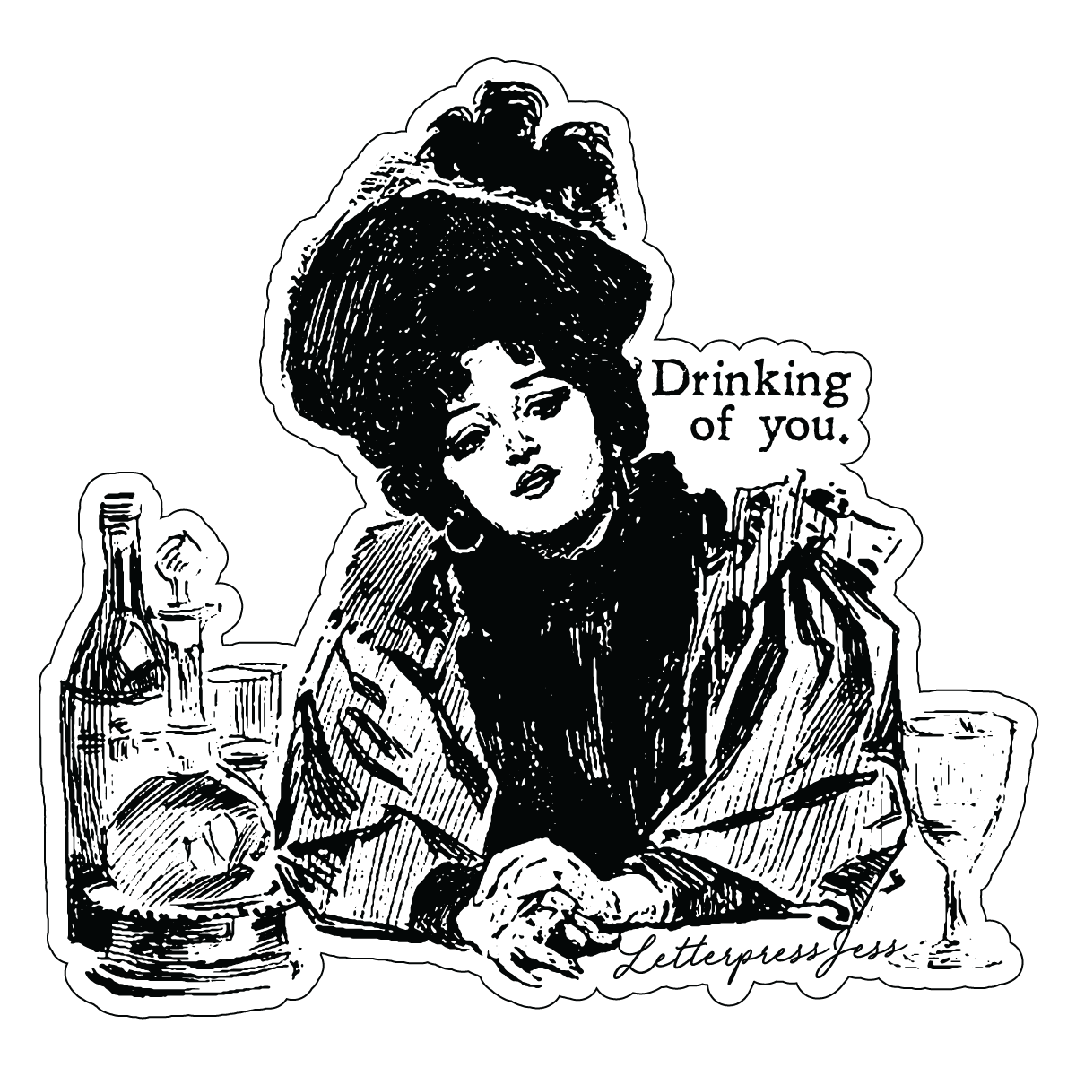 Vinyl sticker featuring Charles Dana Gibson's Gibson Girl illustration. Sticker reads: "Drinking of You." Created by Letterpress Jess. Size: 3.6" x 3.4". Paper: Vinyl.