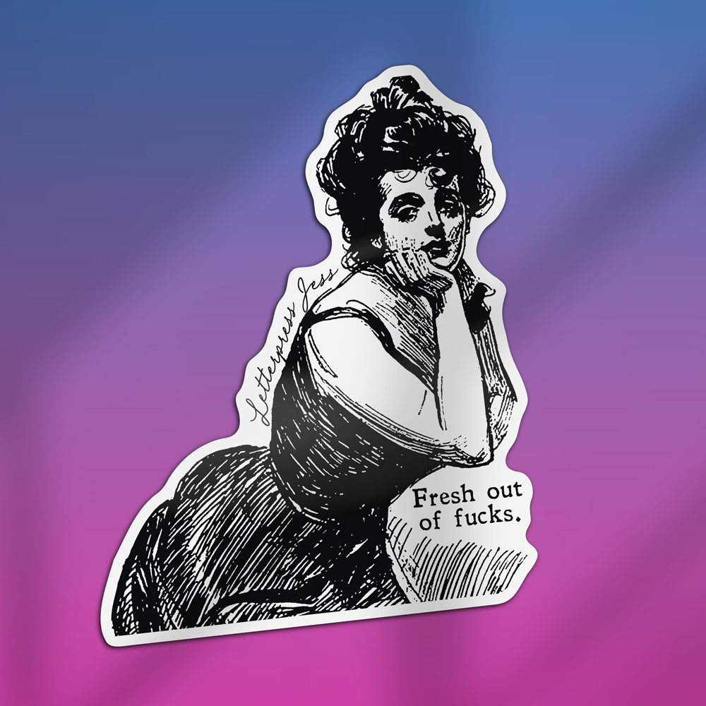Vinyl sticker featuring Charles Dana Gibson's Gibson Girl illustration. Sticker reads: "Fresh Out of Fucks." Created by Letterpress Jess. Size: 3" x 3.7". Paper: Vinyl.