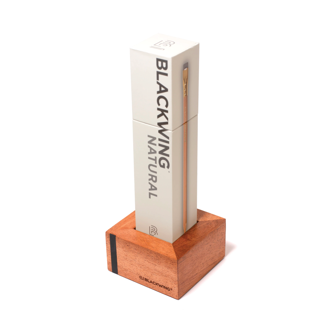 This solid mahogany display is designed to showcase a single 12-pack Blackwing pencil box in an upright position.