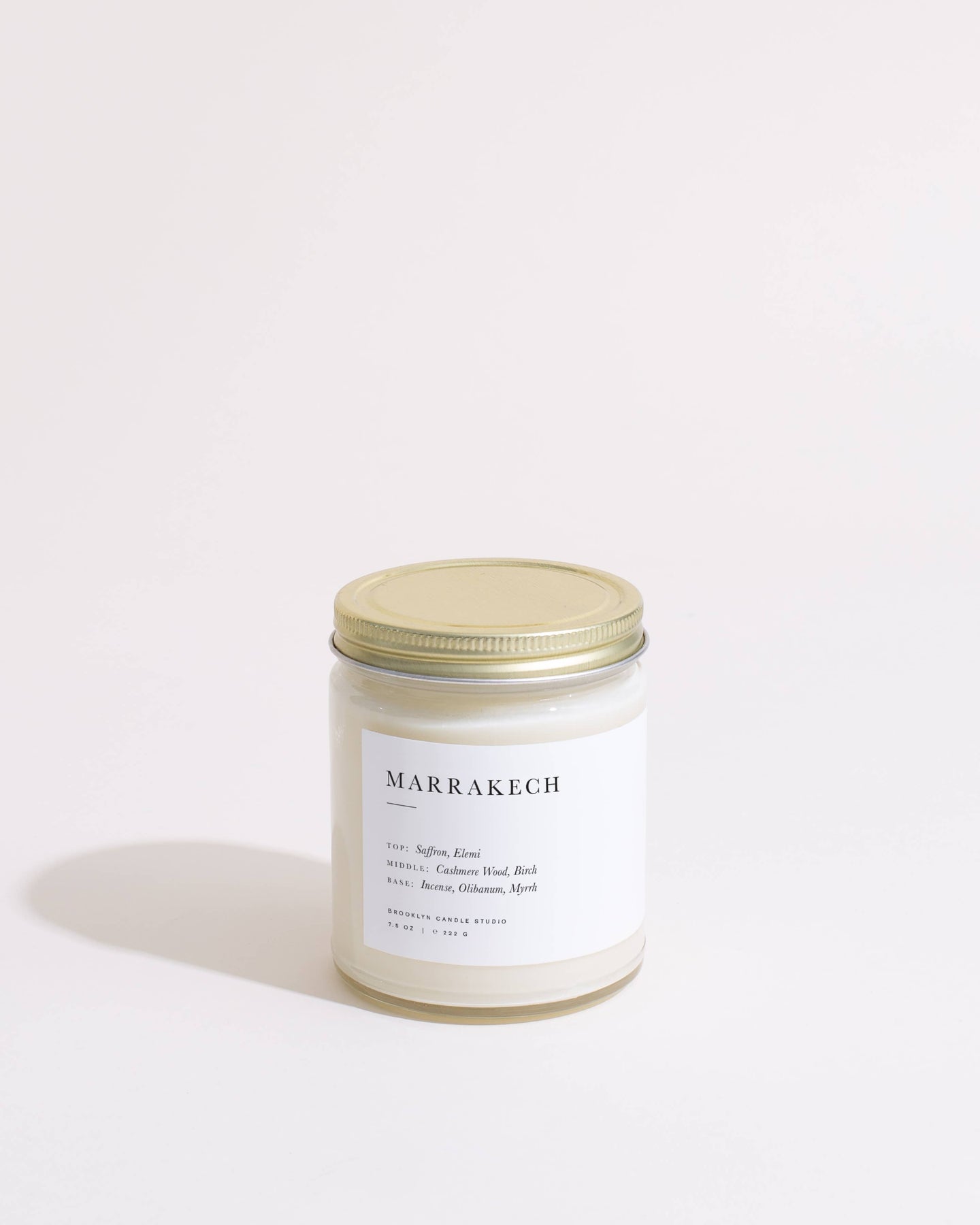 Leathery, honeyed notes of saffron emanate from Place Des Épices, the spice market in the heart of Marrakech, commingling with a soft background of myrrh and sandalwood incense, an olfactive escape to the aromatic souks of Marrakech. Top notes of saffron, elemi, and cistus dance over a heart of cashmere wood and birch anchored by a rich resinous base of incense, olibanum, and myrrh. Elegant straight sided clear glass jars with modern minimalist labels. Perfect next to a bud vase filled with freshly picked blooms or your prettiest succulent on a mantle, nightstand, or coffee table. The brushed gold lids instantly make your candle travel-friendly.