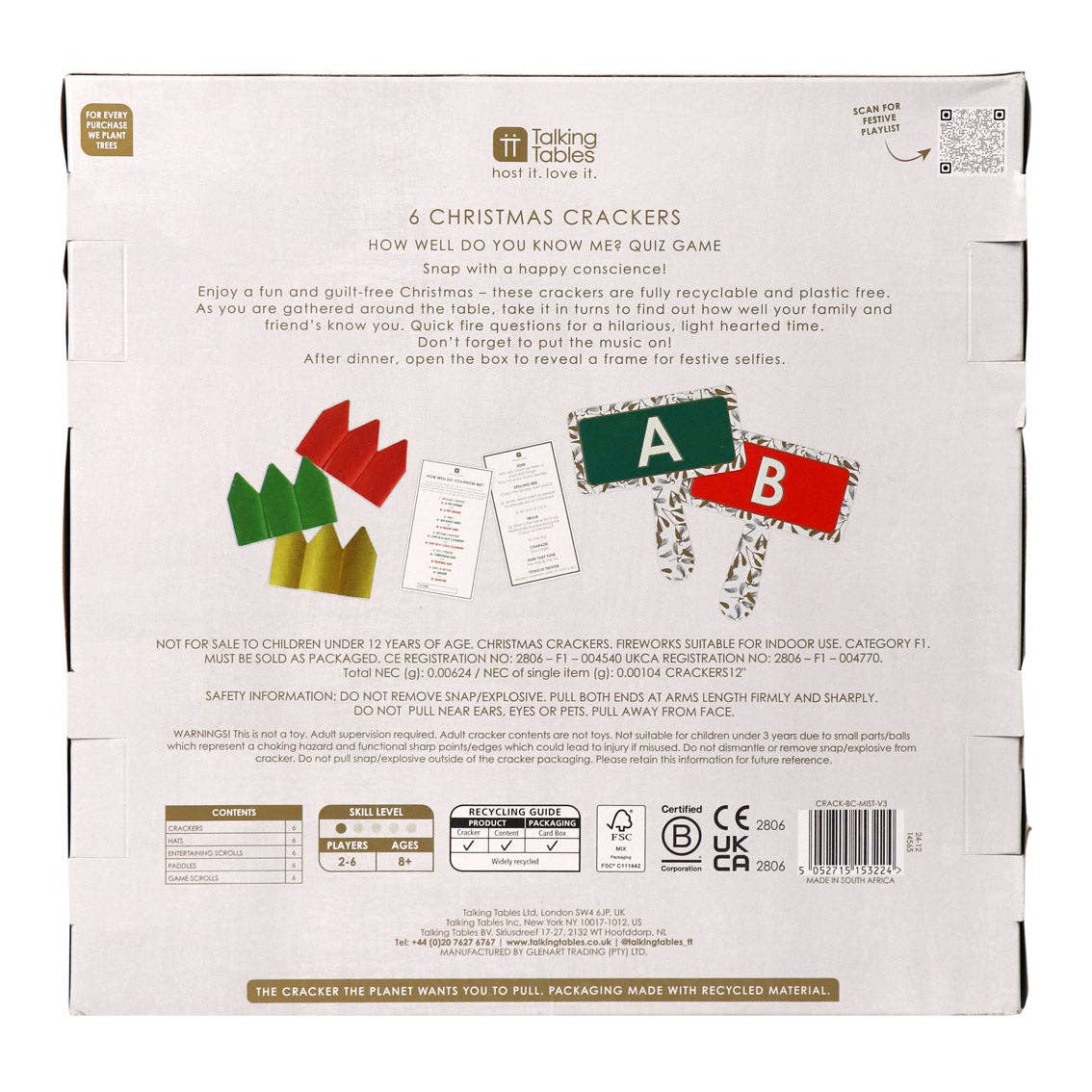 Bring elegance to the holiday table with these white Christmas crackers featuring a mistletoe design with gold and silver accents. Each cracker contains a paper crown, joke, and “How Well Do You Know Me” game with six paddles and cards.