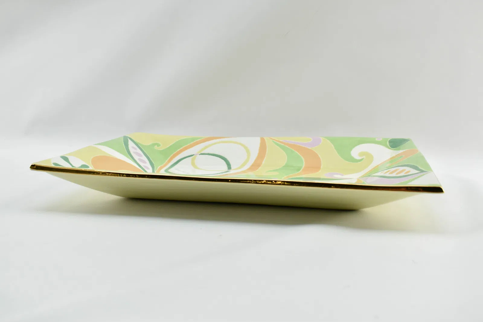 Large rectangular platter with multicolored design and gilt finish edge. Signed Jill Rosenwald on underside. Also labeled Shake - Lime on underside.