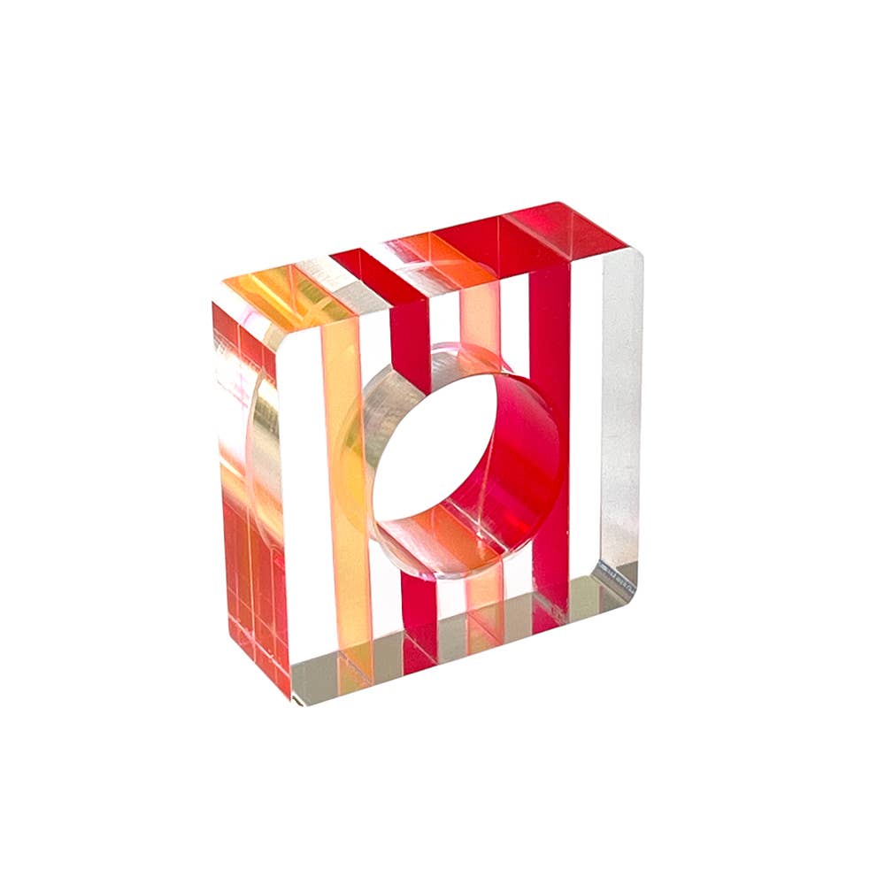 These lively, unique Napkin Rings adapt to any table setting. They come in a set of four pieces and are 2" wide. Safe, shatterproof layered acrylic, made with a unique process of layered acrylic. Easy to care for, simply wipe if necessary with a soft, damp cloth. Available in 4 color combinations in Square or Round. Galactic purple-blue layers for a stellar style, sunny yellow-orange slices to brighten your space, oceanic blue-green make a decorative splash, and deep red-orange hues that will glow through the home. Complete your table set and house decor with CANETTI® Napkin Rings, Vase, and Candle Holders. Do not put Napkin Rings in dishwasher.