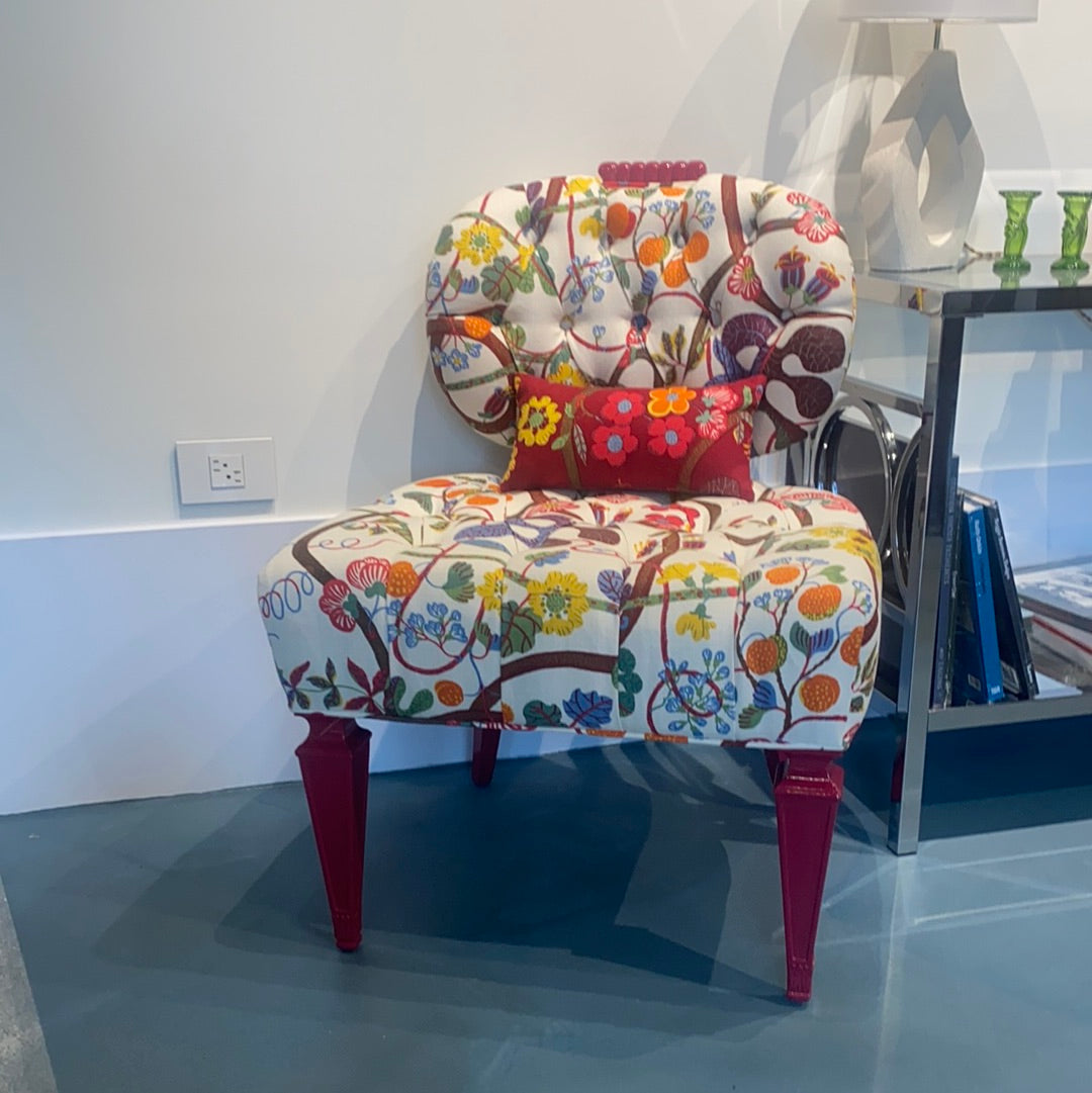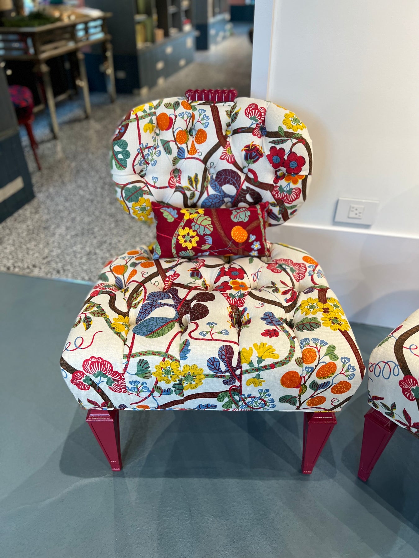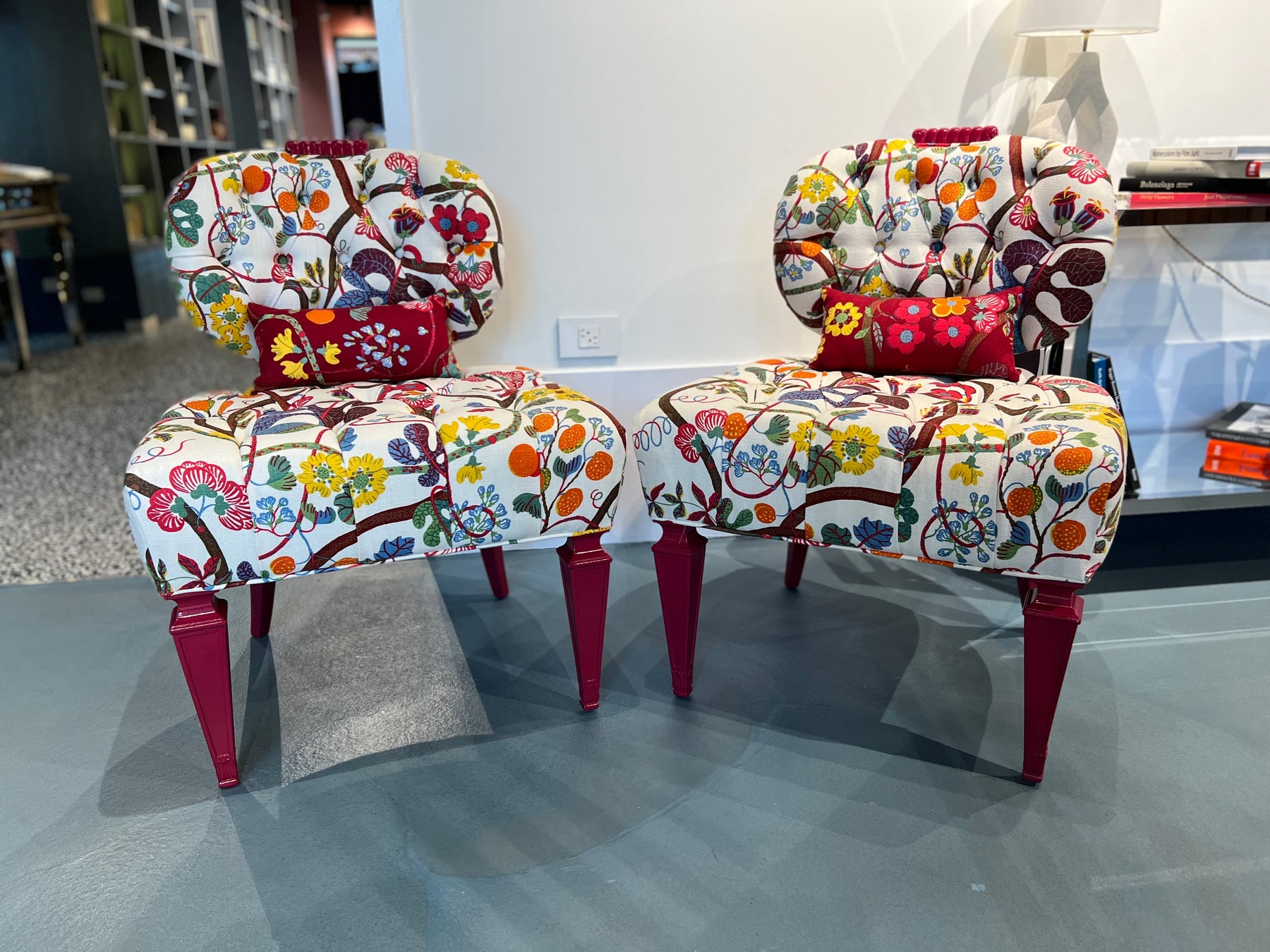 A pair of Hollywood Regency period chairs with button tufts and wide seats.  Recently repainted and reupholstered by hand in a Brooklyn workshop with Josef Frank Barranquilla print.  Small lumbar pillow in contrasting color way included with each chair.  Dimensions: H 35" x W 27" x D 26" x SH 19"