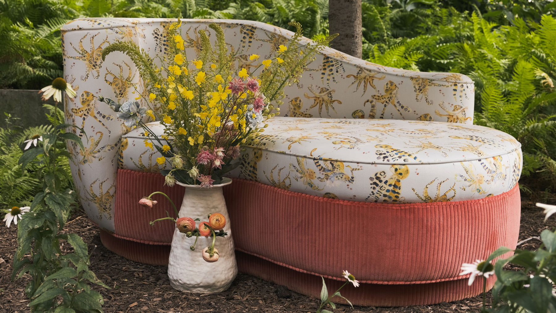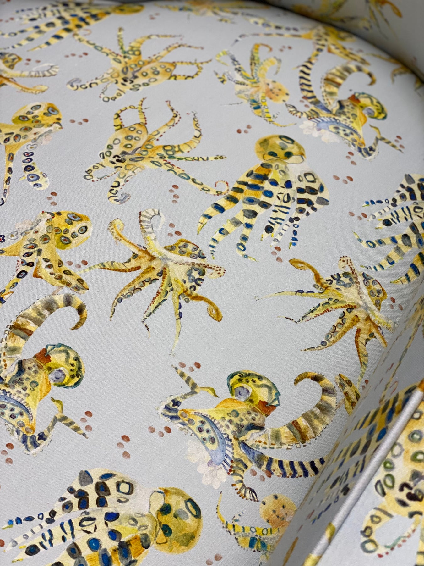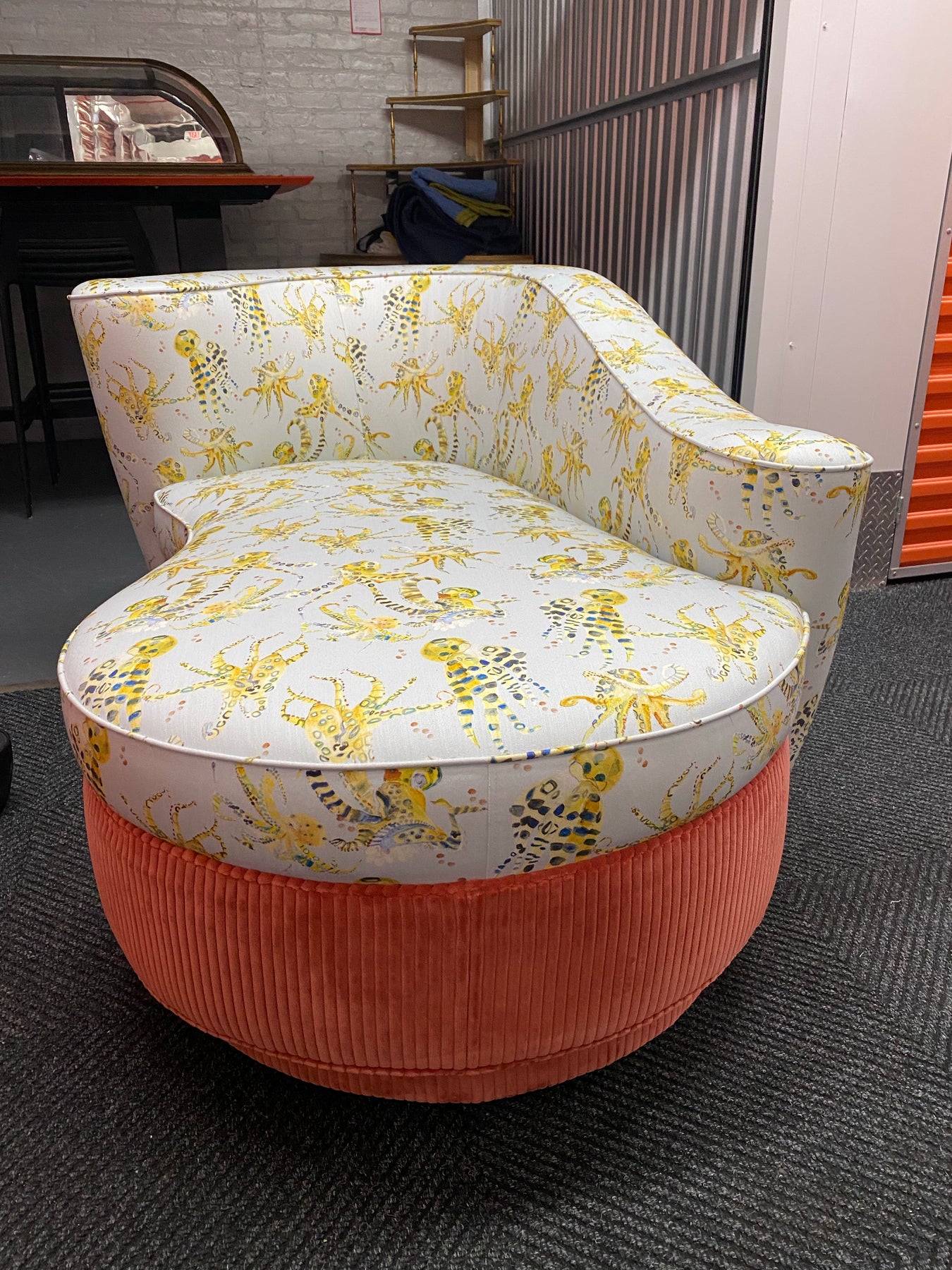 Vladimir Kagan style loveseat / chaise longer reupholstered by hand in a Brooklyn Workshop in 2021 with Voutsa (ocotopussi) and Cowan & Tout upholstery. Insanely comfortable. 30"H x 64"L x 38"W