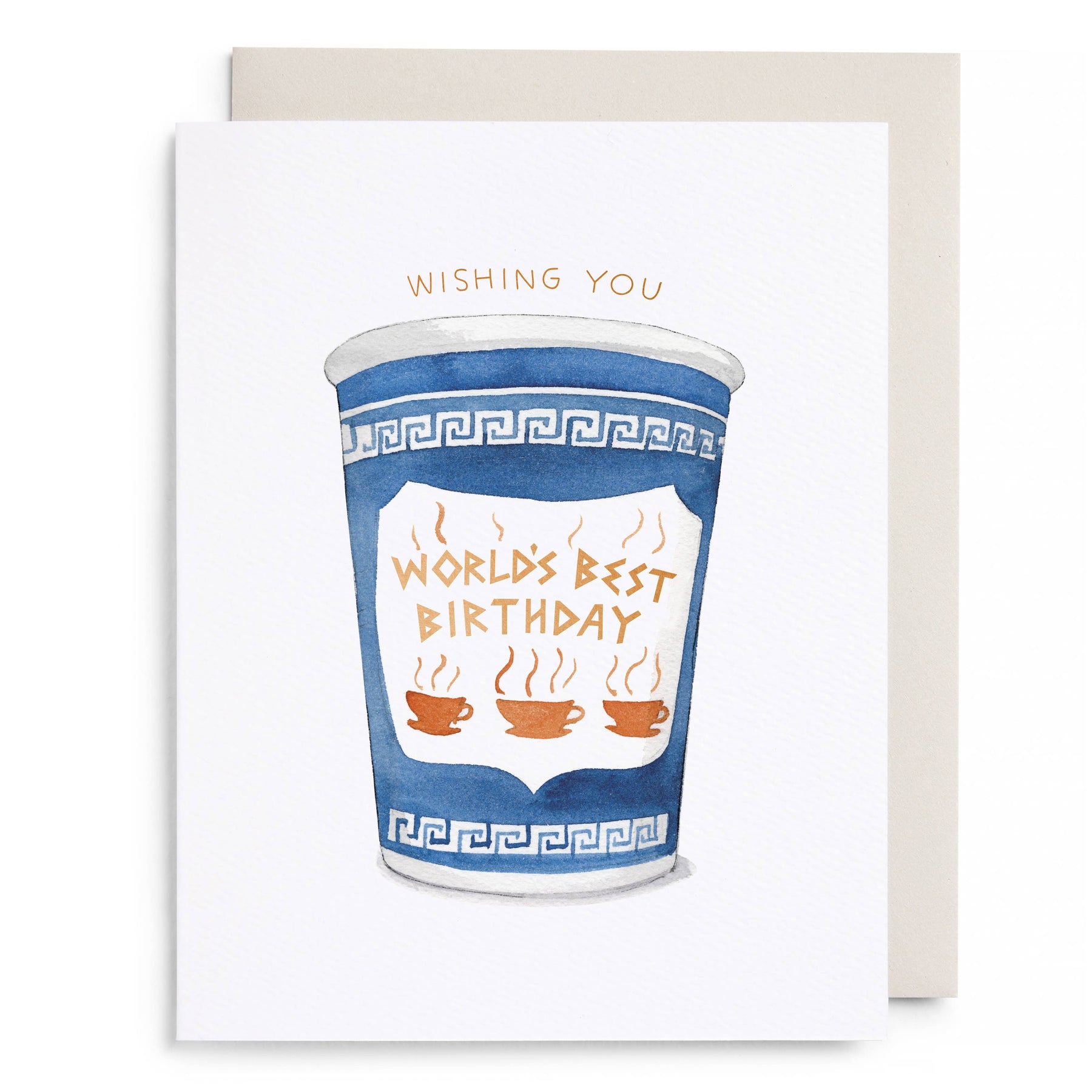 Each E. Frances card begins as an original watercolor painting, is then printed in brilliant color on luxe, heavyweight paper and is finally kissed with gold foil. Made in the USA. Celebrate birthdays with a caffeine kick using the World’s Best Coffee Birthday Greeting Card, showcasing a classic Greek diner coffee takeaway cup design. Perfect for coffee lovers, birthday greetings, and fans of retro diner vibes. Send warm wishes with a fun, aromatic twist!