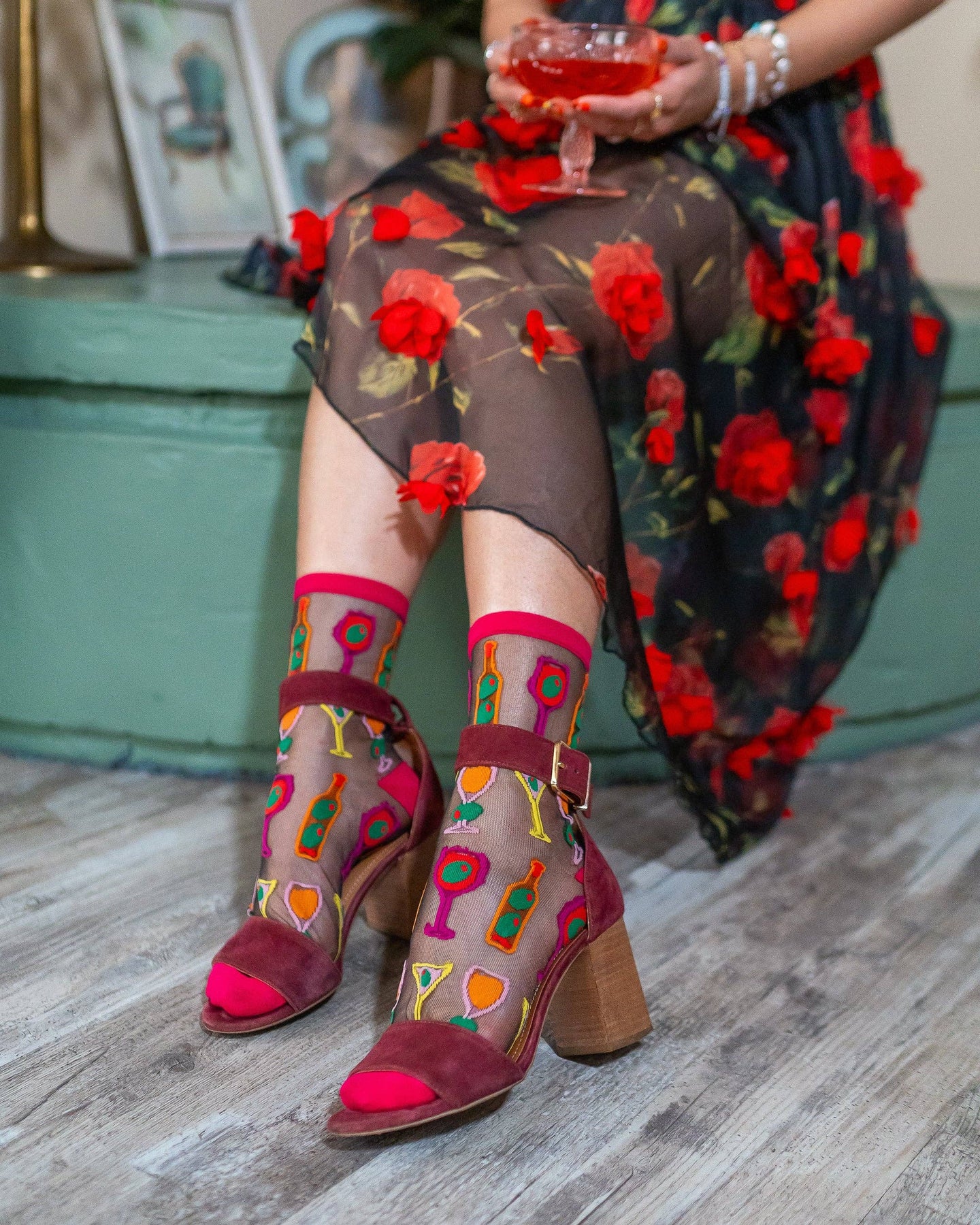 Our Cocktail Hour black sheer sock features wine glasses, martinis, and wine bottles with an unexpected olive twist. The graphic print and electrifying colors give this sock an art museum vibe, perfect for paint and sip nights with the girls. Finished with a mulberry colored cuff, heel, and toe for a sultry look.