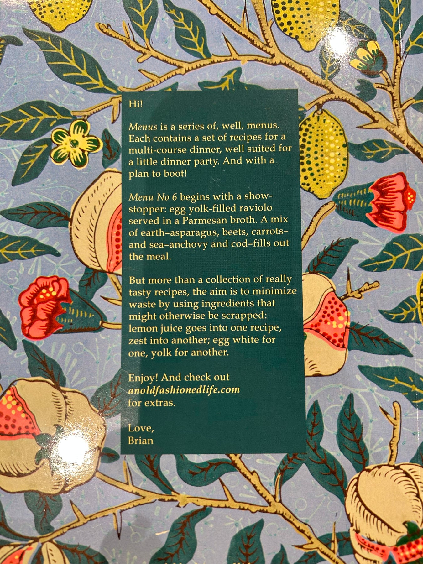 This is part of an imaginative series of small books, each of which offers a charming seasonal dinner menu. There is a confident, thoughtful unpredictability about them which we greatly admire.