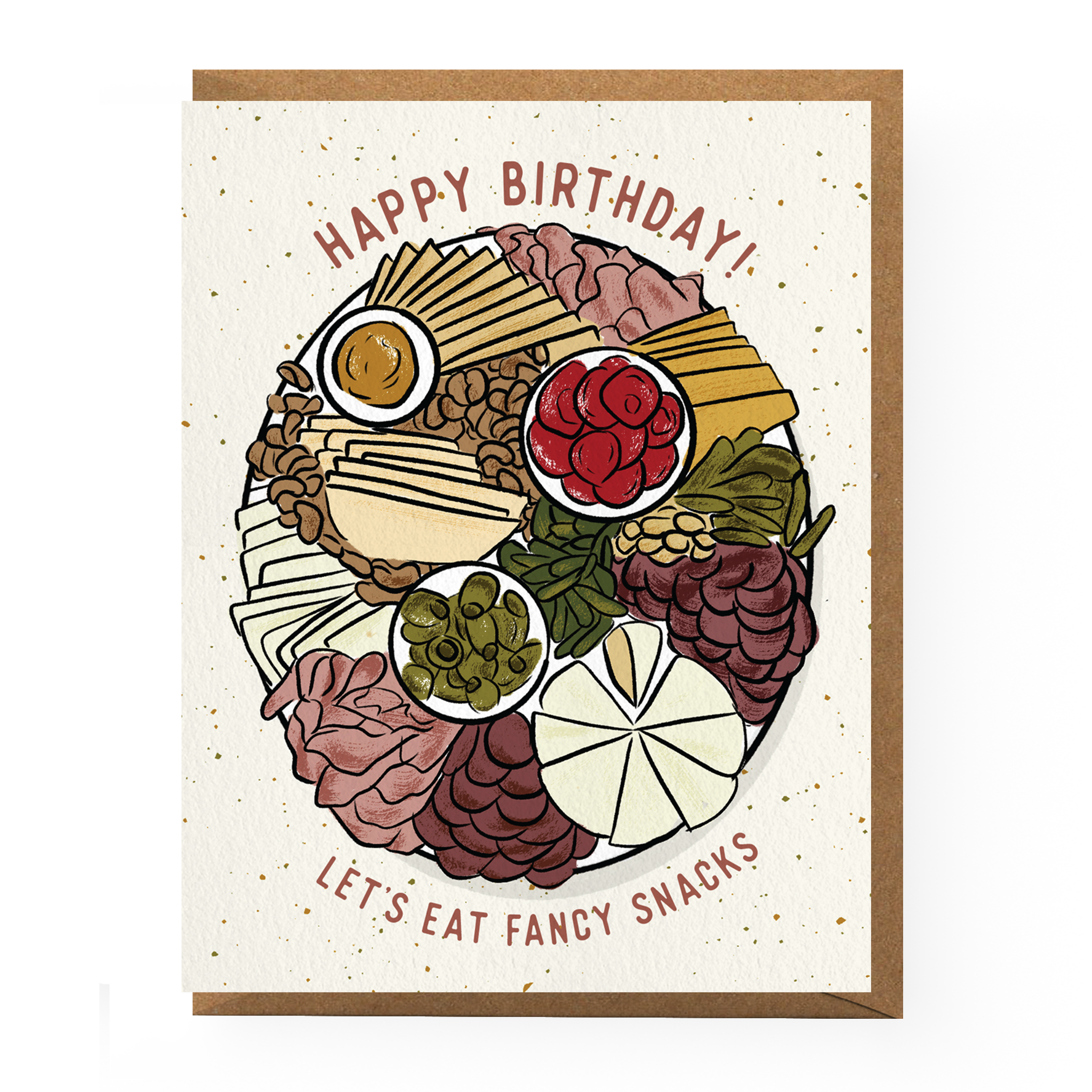 No birthday celebration is complete without a cheese and charcuterie platter filled with the fanciest snacks. Perfect birthday card for cheese lovers! Our best selling greeting card! Printed on 100% recycled paper and paired with a coordinating envelope. Blank inside and sealed in a protective cellophane sleeve. Size A2 (4.25" x 5.5"). Card reads "Happy birthday / let's eat fancy snacks" and features an illustrated cheese and charcuterie board.