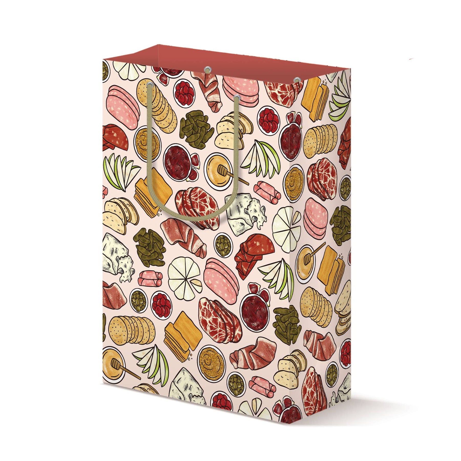 This playfully illustrated gift bag celebrates charcuterie favorites, featuring a mouthwatering illustrated spread of meats, cheeses, olives, pickles, spreads, and more. Crafted with ultra-durable, sustainably sourced paper stock and coated in a scuff-resistant matte lamination (aka: it’s fancy and tough), this bag is ready to be used again and again—for birthdays, host gifts, housewarmings and more. Just add tissue paper and go! • Size: 9.6" W x 13" H x 4.5" D (comfortably fits three wine bottles, plus room for snacks!) • Folded upper lip, metal grommets, and tan braided rope handles • Printed edge to edge in full color • Gusseted sides and a reinforced flat bottom for extra support • Designed in Brooklyn and made in the USA • Features an illustrated charcuterie pattern filled with meats, cheeses, spreads, olives, pickles, honey, mustard and more!