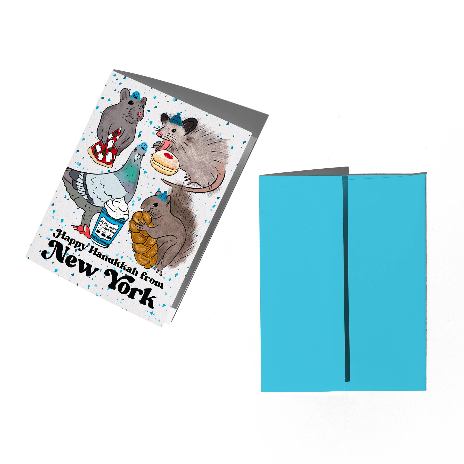 Send Hanukkah wishes from New York with this selection of the city's most snack-obsessed animal icons. Printed on 100% recycled paper and paired with a coordinating envelope. Blank inside and sealed in a protective cellophane sleeve. Size A2 (4.25" x 5.5"). Card reads "Happy Hanukkah from New York" and features illustrations of a pizza-loving rat, a pigeon with a coffee cup, a squirrel with challah, and a possum feasting on sufganiyah.