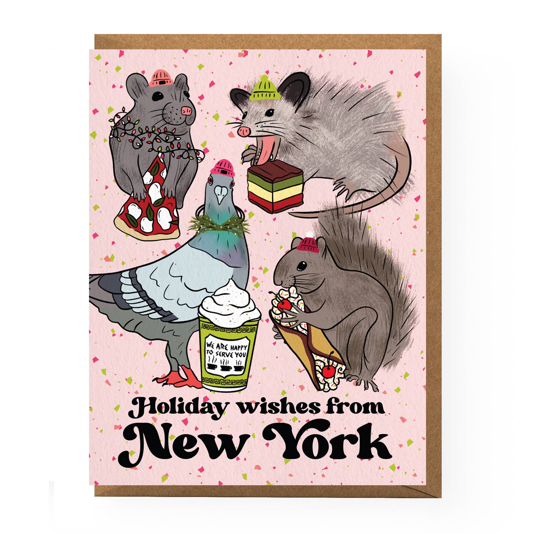 Send holiday wishes from New York with this selection of the city's most snack-obsessed animal icons. Printed on 100% recycled paper and paired with a coordinating envelope. Blank inside and sealed in a protective cellophane sleeve. Size A2 (4.25" x 5.5"). Card reads "Holiday Wishes From New York" and features illustrations of a pizza-loving rat, a pigeon with a coffee cup, a squirrel with a holiday cannoli, and a possum feasting on rainbow cake.