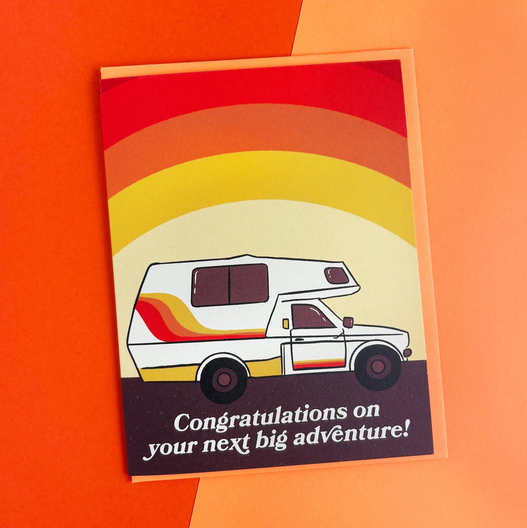 Celebrate life transitions with a nostalgic retro camper — perfect for graduations and big moves! Printed on 100% recycled paper and paired with a coordinating envelope. Blank inside and sealed in a protective cellophane sleeve. Size A2 (4.25" x 5.5"). Card reads "Congratulations on your next big adventure!" and features a retro camper illustration paired with a rainbow in maroon, rust, orange and mustard. Perfect for celebrating a new job or move to a new city!