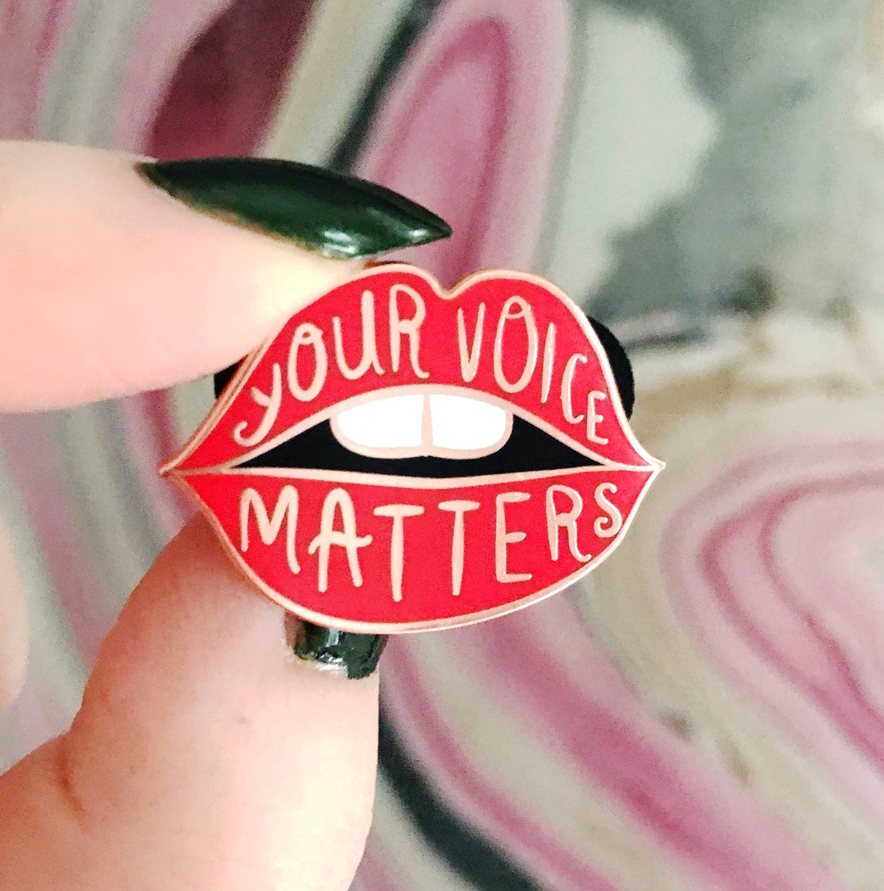 1.25" wide hard enamel pin in rose gold metal with white, red and black inks, paired with a backing card and sealed in a clear sleeve