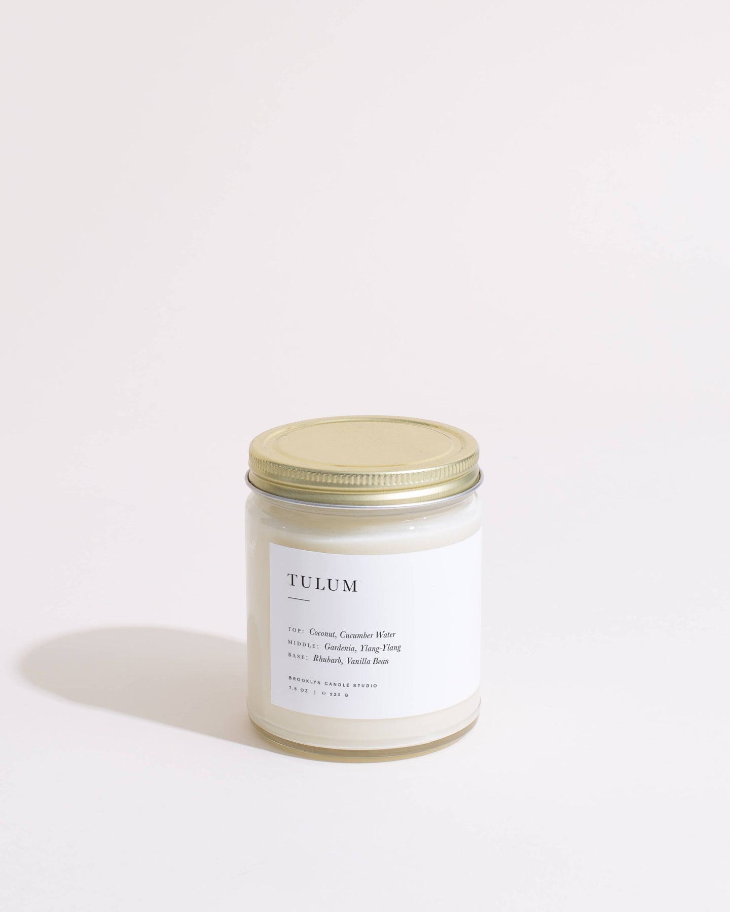 Amongst fragrant gardenia blossoms and beachside coconut palms, nirvana awaits in Tulum. Top notes of cucumber water and coconut husk wade above a heart of gardenia and ylang-ylang over notes of rhubarb and vanilla bean: an olfactory translation of the tranquil tropical oasis so you never have to leave. Elegant straight sided clear glass jars with modern minimalist labels. Perfect next to a bud vase filled with freshly picked blooms or your prettiest succulent on a mantle, nightstand, or coffee table. The brushed gold lids instantly make your candle travel-friendly.