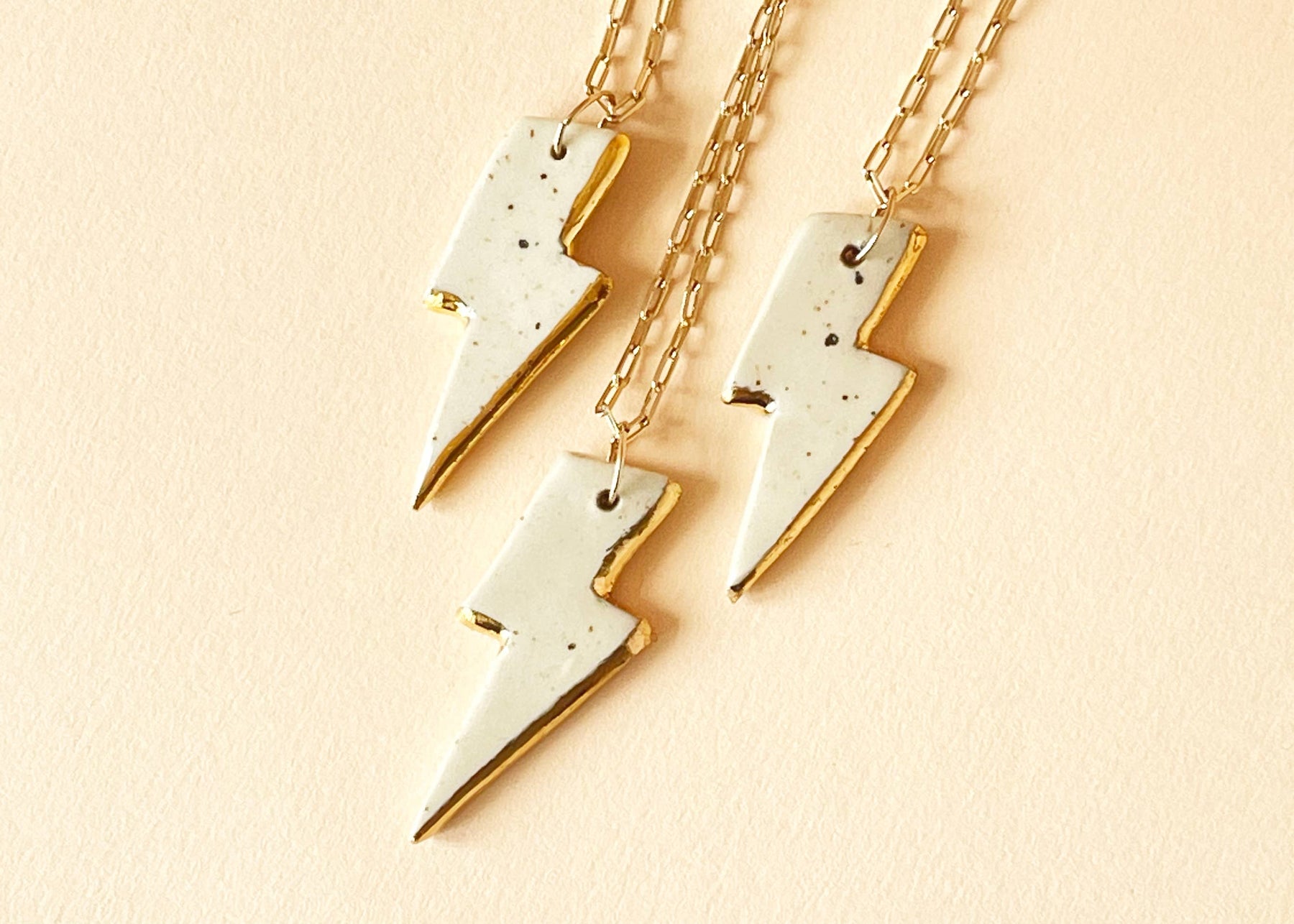 A lightning shaped charm handmade in speckled stoneware with delicate and edgy details in premium 22k gold set on a 18' gold filled paperclip chain.