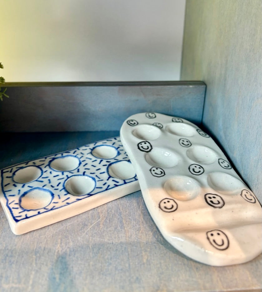 Highly functional, fun and stylish pieces like plates, mugs, vases, soap dishes and trinket trays, all made from clay.  Seasonally you'll find some cool menorahs and tree ornaments.