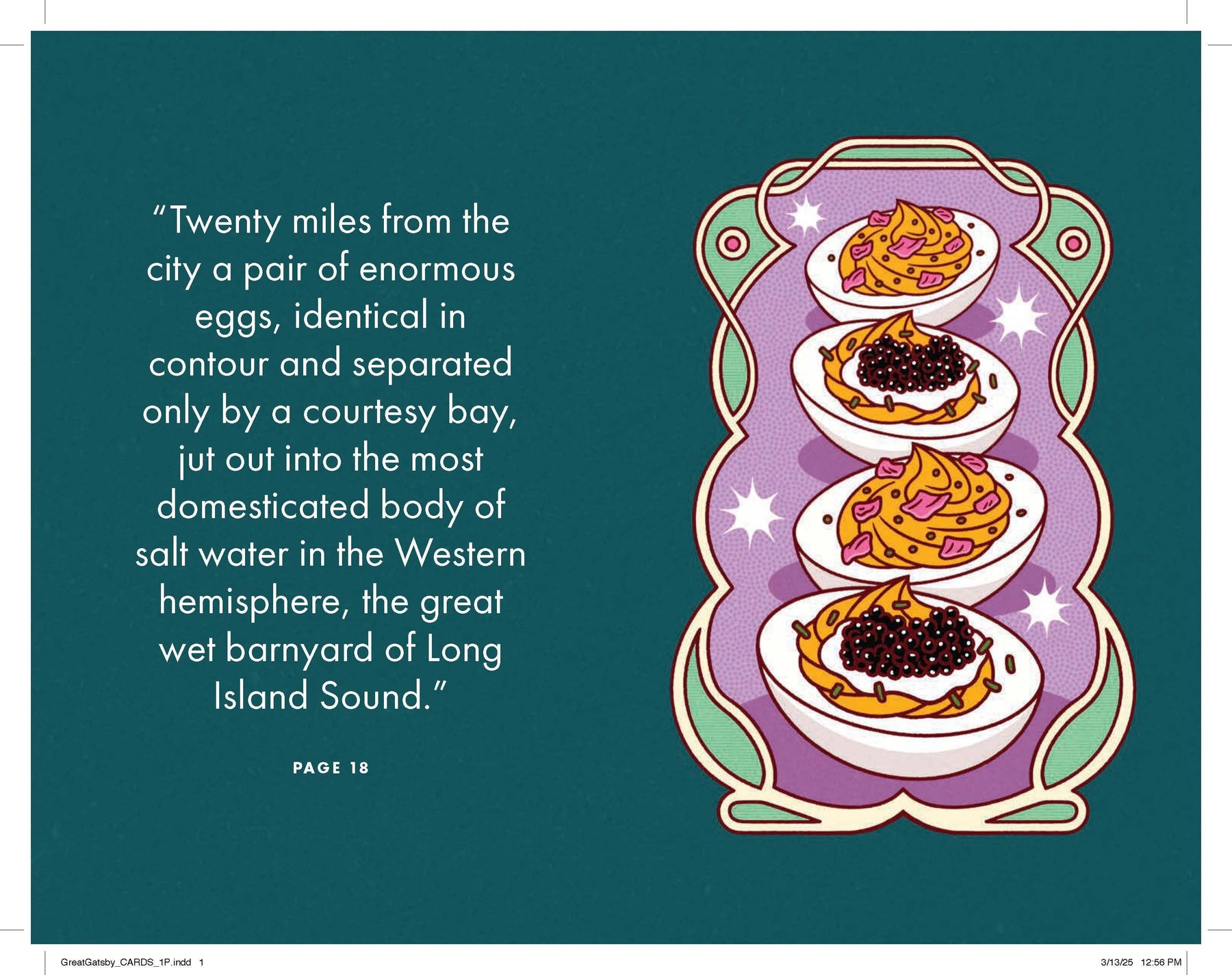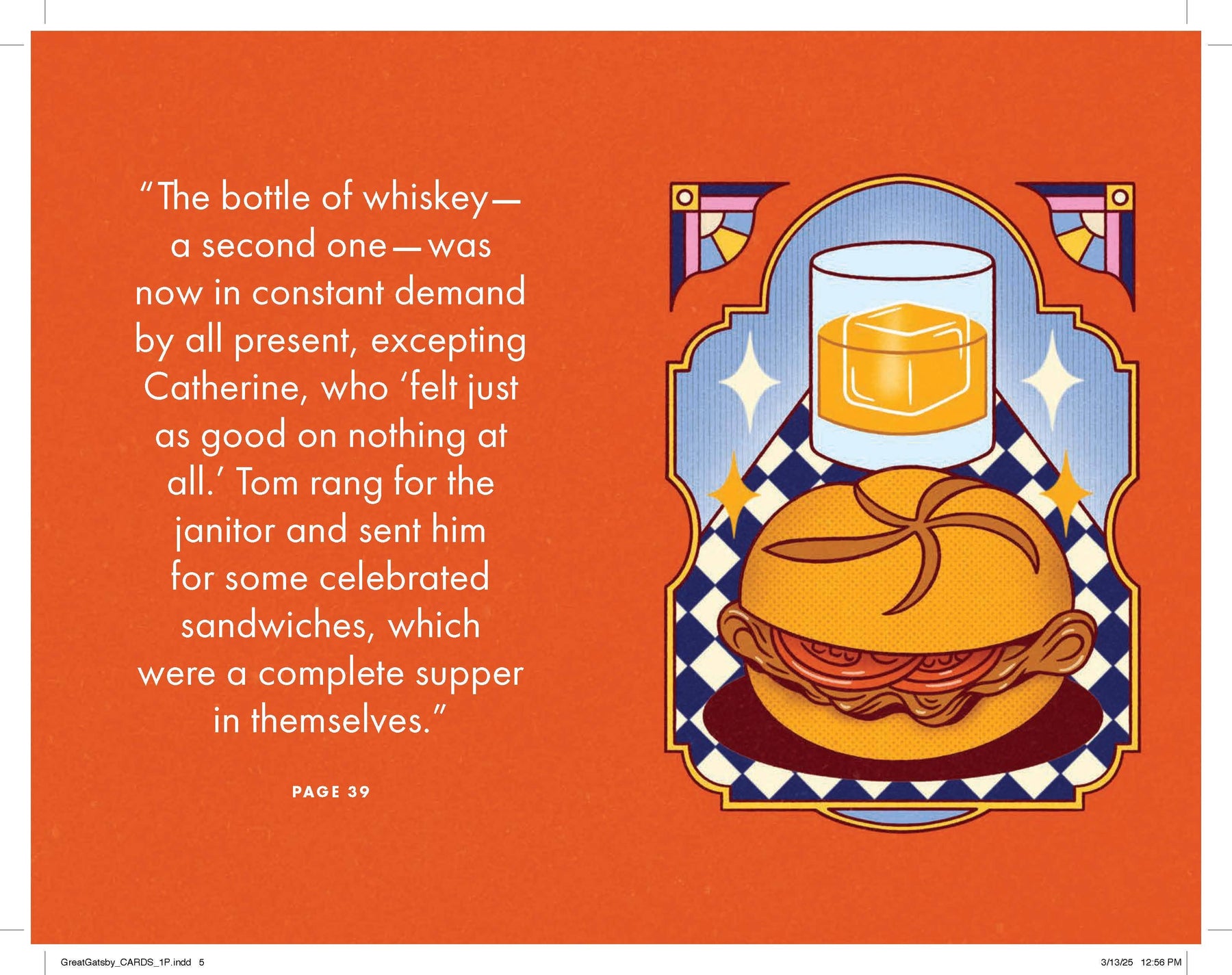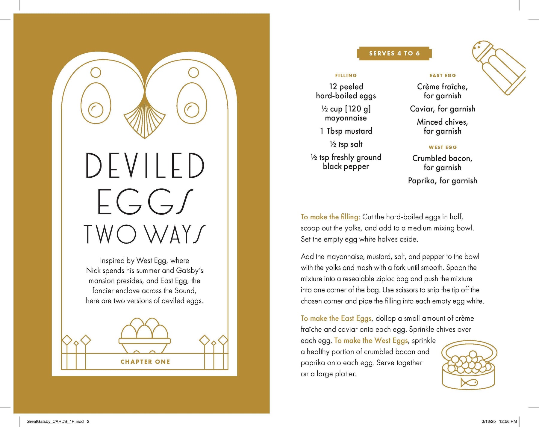 Raise your coupe and step into the delicious world of The Great Gatsby with this ineffably entertaining edition of the complete novel featuring food and drink recipes throughout. For every devotee of F. Scott Fitzgerald’s great American classic, this very special edition of The Great Gatsby is an absolute must-have. Inside, readers will discover 15 recipes inspired by the meals and libations enjoyed by the novel's beloved characters. Tucked craftily within the pages of the full-length novel are removable cards with food and drink recipes inspired by the story—from indulgent cocktails to enticing appetizers to languorous sweets—so you can truly experience the decadent world of Gatsby: * Sip on Daisy's Julep while curled in an armchair, puzzling over Gatsby’s paradoxical motives.
