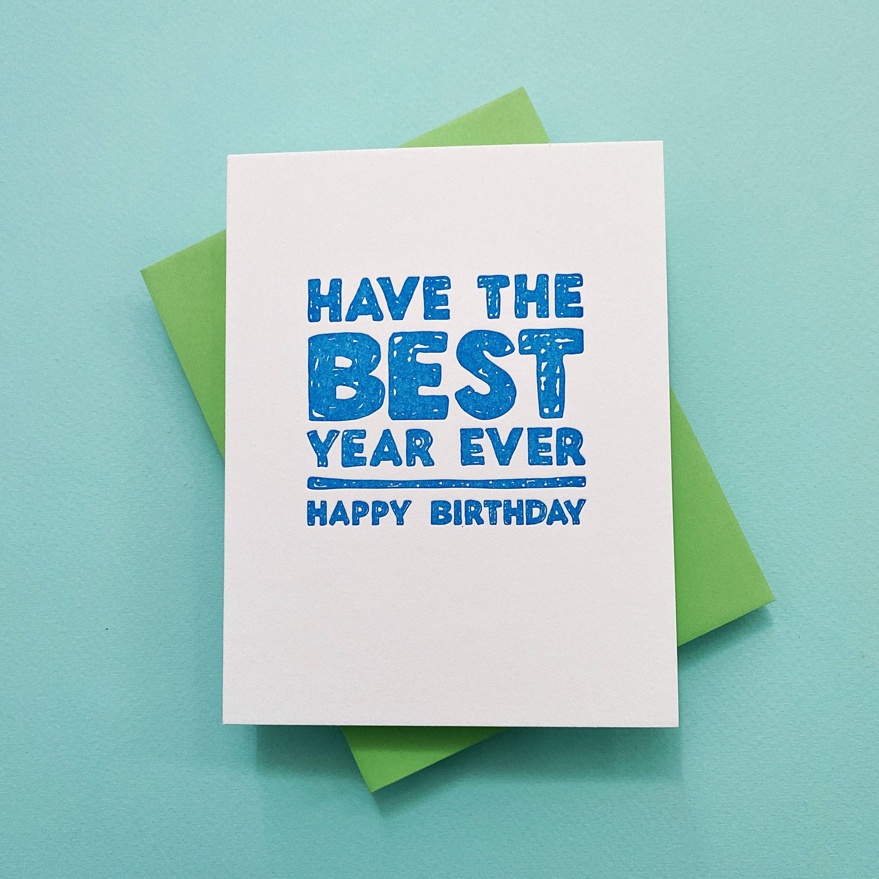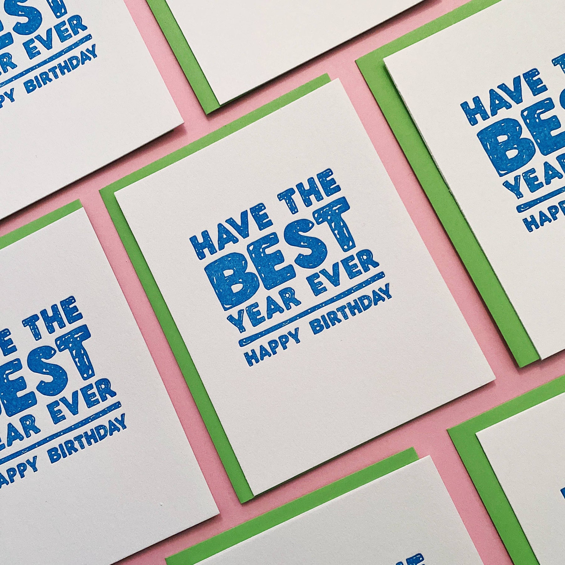 Letterpressed card on thick, yummy, cotton paper. Our Crane's Cotton paper is the best in the industry. Hand printed on our vintage press in Long Beach, CA. Printed with neon blue ink and paired with a lime green envelope. We redesigned one of our best selling cards. Just a nip and tuck! Hand lettered A2 4.25" x 5.5" packaged in cello bag best friend gift, bestie birthday, bestie gift, happy birthday, best birthday, birthday gift, birthday for him, birthday for her, greeting card, letterpress, handmade