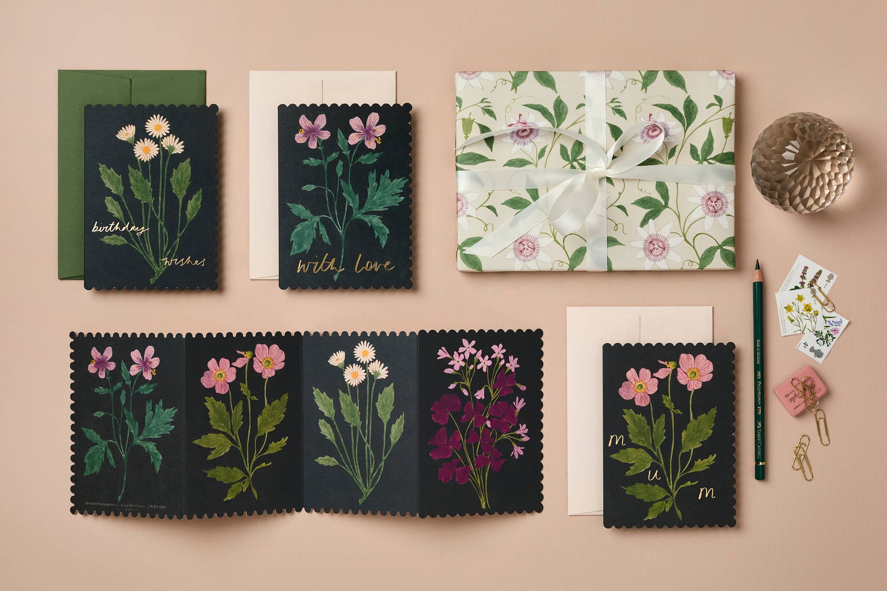 A new addition to our Flora collection, this inky black card has taken inspiration from vintage botanical drawings. It features a die cut scalloped edge, beautiful floral illustration and golden foil on the front and back of the card. We've paired this card with a luxury blush pink envelope. Designed and packed with care from our studio in Hove, England. Printed in the UK on FSC certified papers SKU WAN 6105