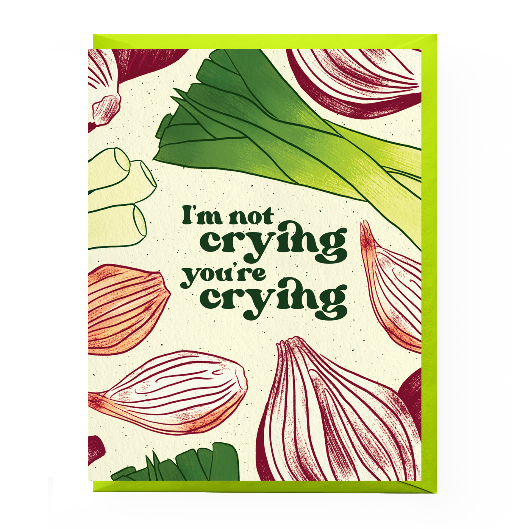 Send heartfelt congratulations for life's most tear-inducing milestones. Perfect for graduations, weddings, new babies and more! Printed on 100% recycled paper and paired with a coordinating envelope. Blank inside and sealed in a protective cellophane sleeve. Size A2 (4.25" x 5.5"). Card reads "I'm not crying, you're crying" and features illustrated leeks, onions and shallots in green, plum and peach.
