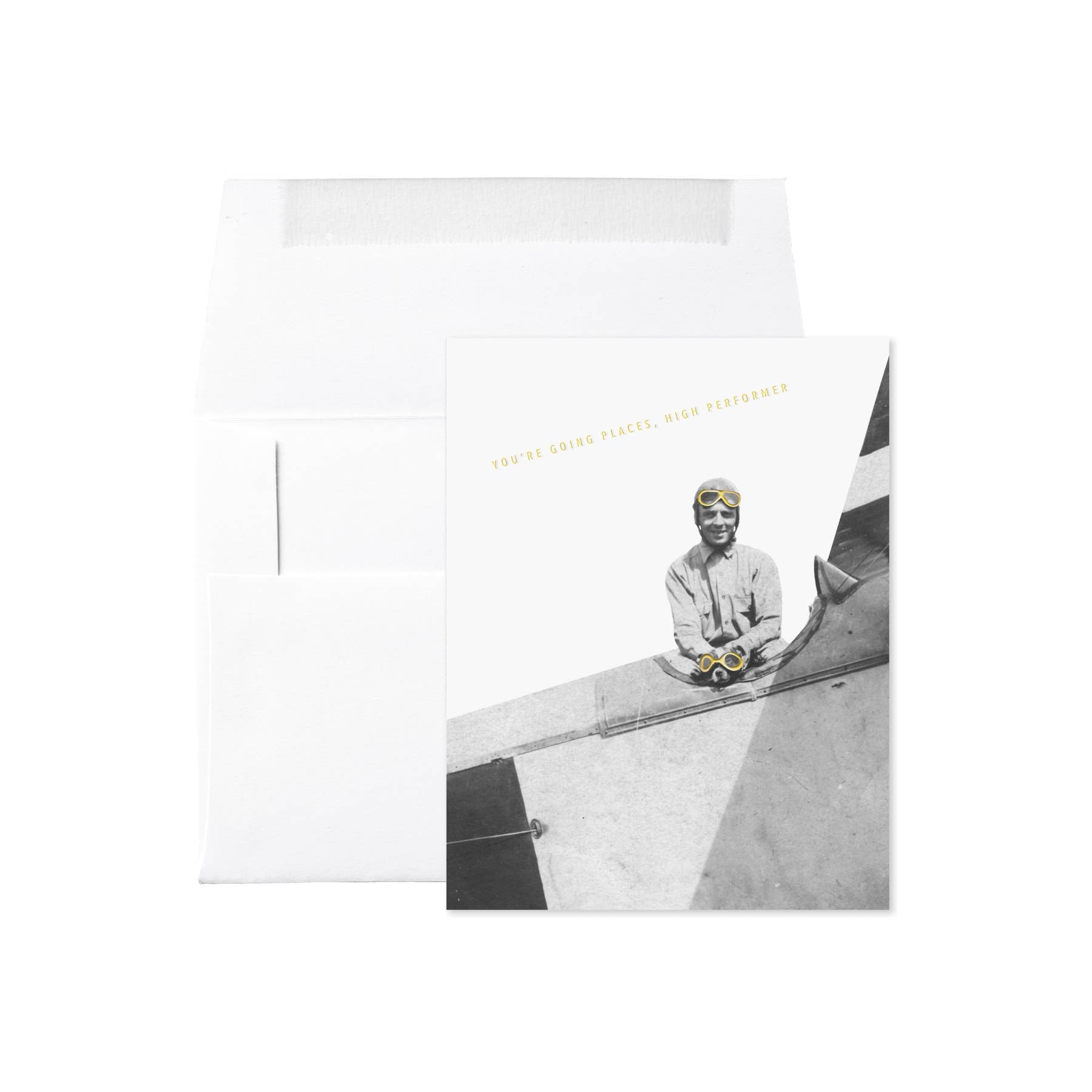 From the Origin Unknown series. Photograph from Beth's collection of anonymous antique photographs. Front image relates to back in Embued's signature card style. Front reads : YOU’RE GOING PLACES HIGH PERFORMER Foil stamped. Blank inside. Size : A2 : 5.5 x 4.25 folded card. 100% post-consumer white card stock / white envelope