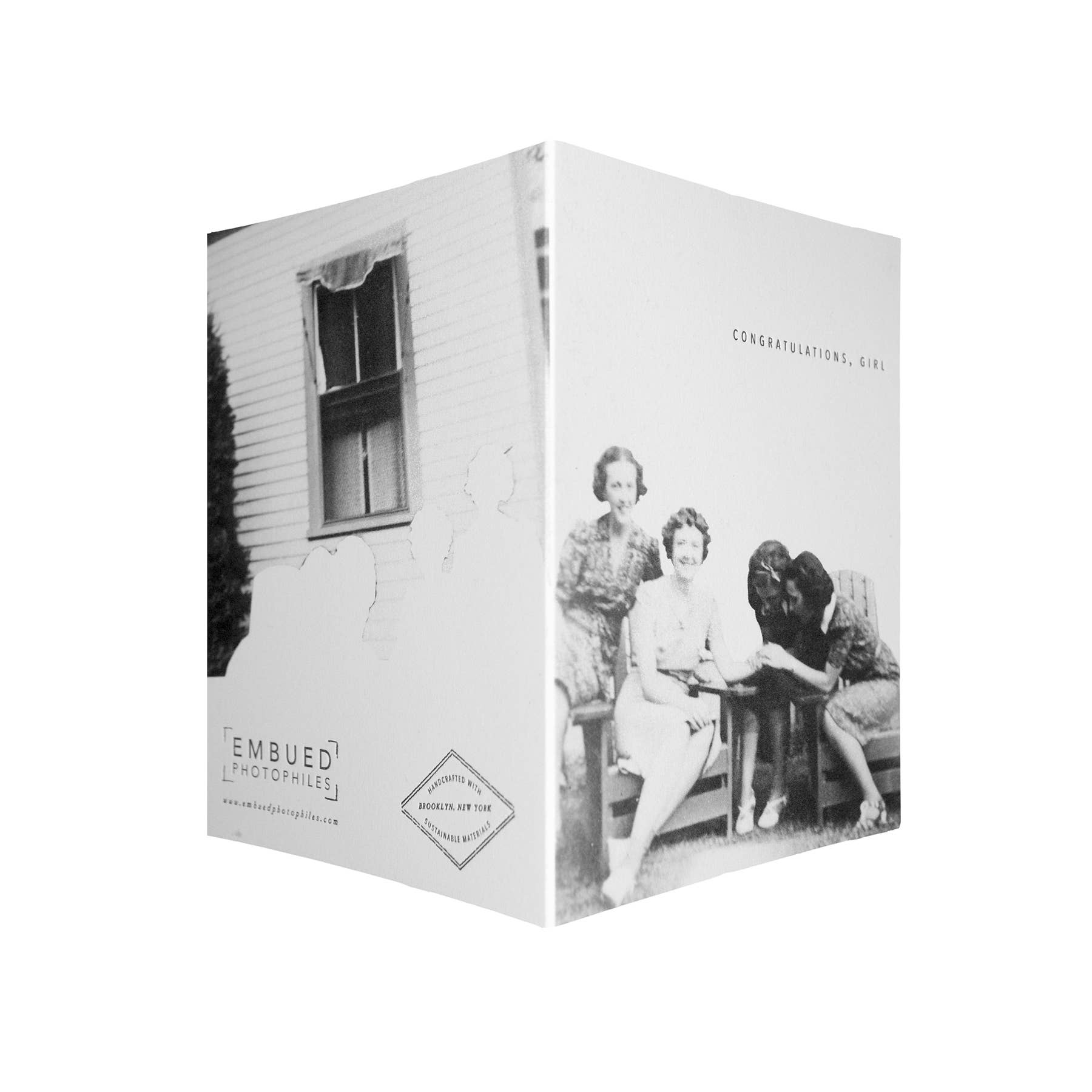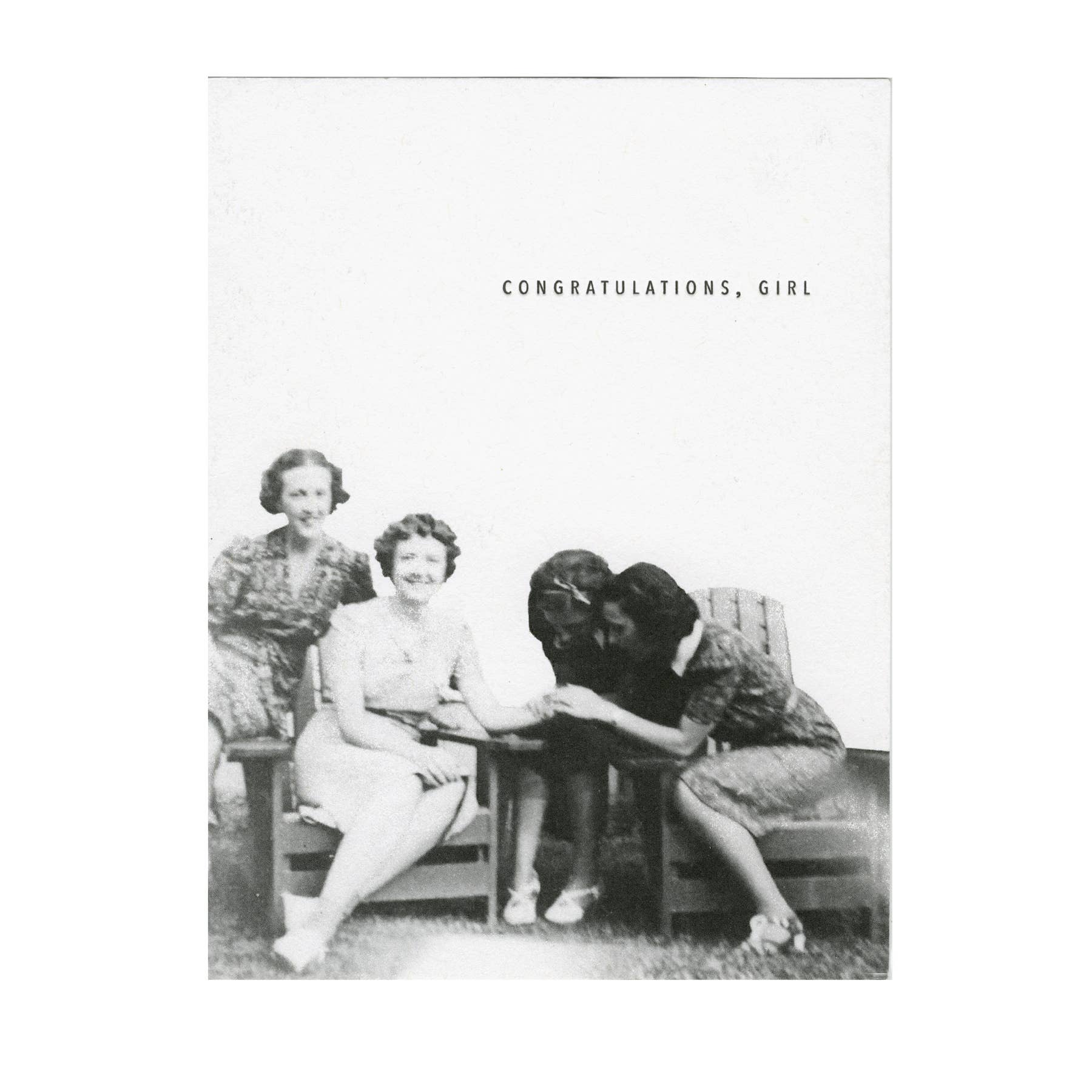 From the Origin Unknown series. Photograph from Beth’s collection of anonymous antique photographs. Front image relates to back. Front reads : CONGRATULATIONS, GIRL Blank inside. Letterpressed 100% post-consumer white card stock / white envelope Handmade in Brooklyn, NY. Card size : 5.5 x 4.25” folded card