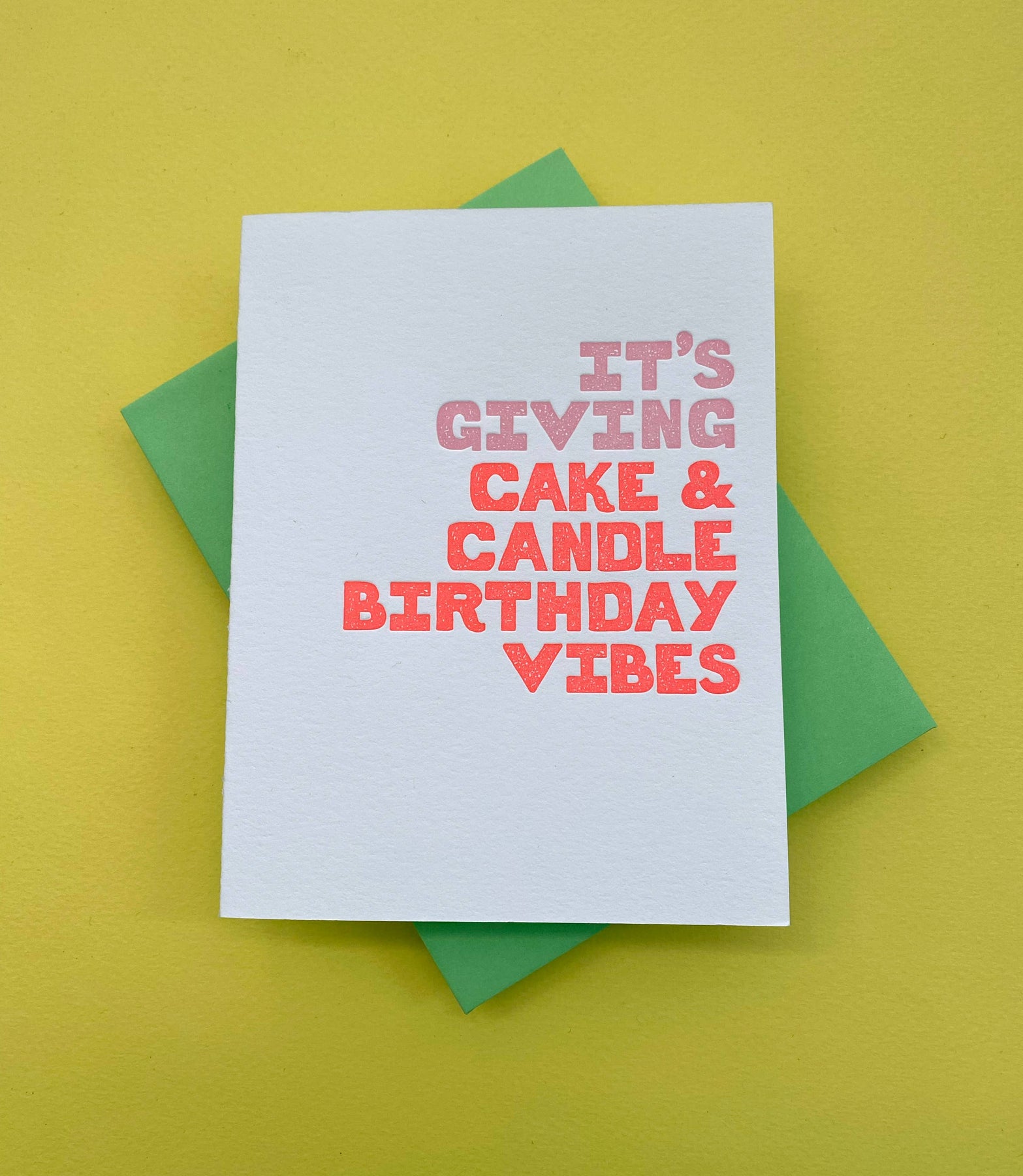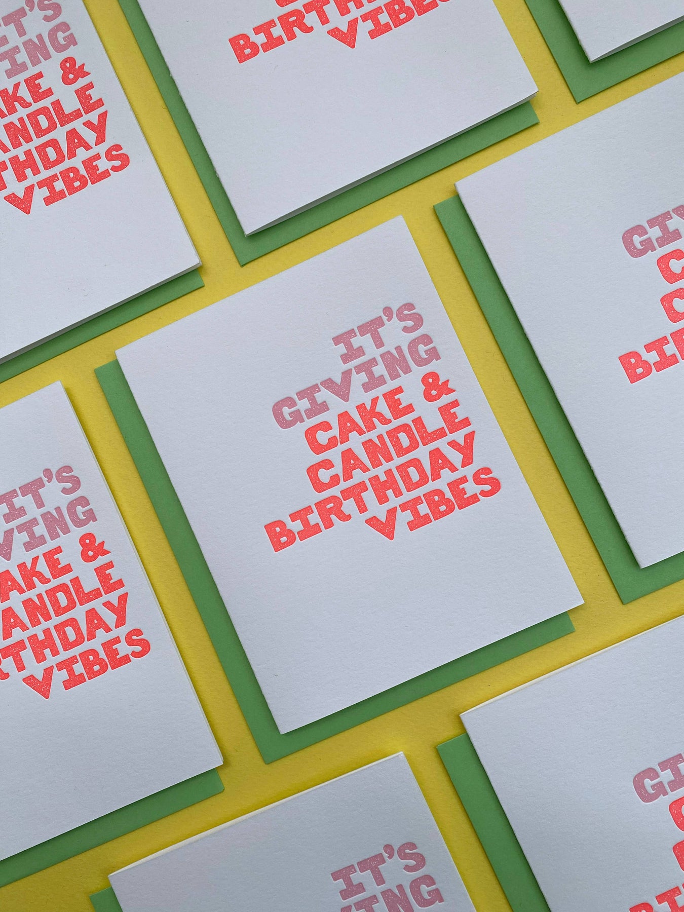 As the kids say these day IT'S GIVING... So It's giving Cake and Candle Birthday Vibes card is blank on the inside. 2 color Letterpressed greeting on Crane's Lettra cotton paper. Super lux to the touch. A2 4.25" x 5.5" hand printed in our Long Beach,CA Studio
