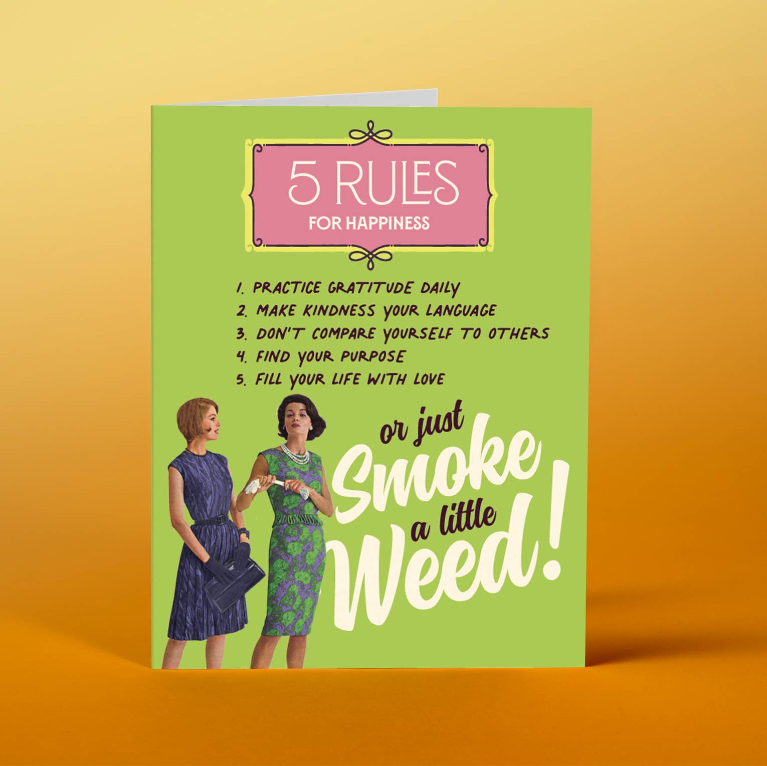5 RULES! Details: Size A2 (4.25 x 5.5); INSIDE: Blank; PAPER: Premium 100lb. Creme Colored Goodness; PRINTING: 4 Color Offset; ENVELOPE: Copper Metallic 80lb.
