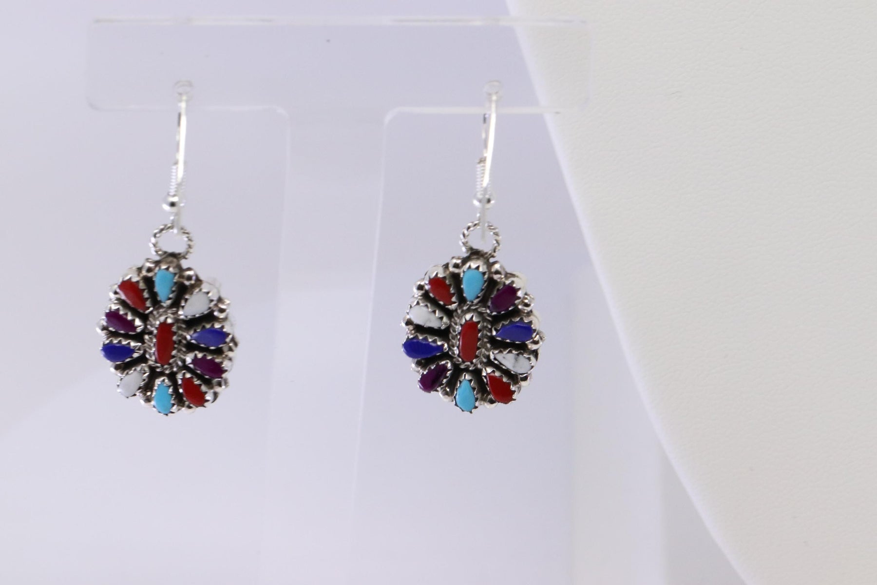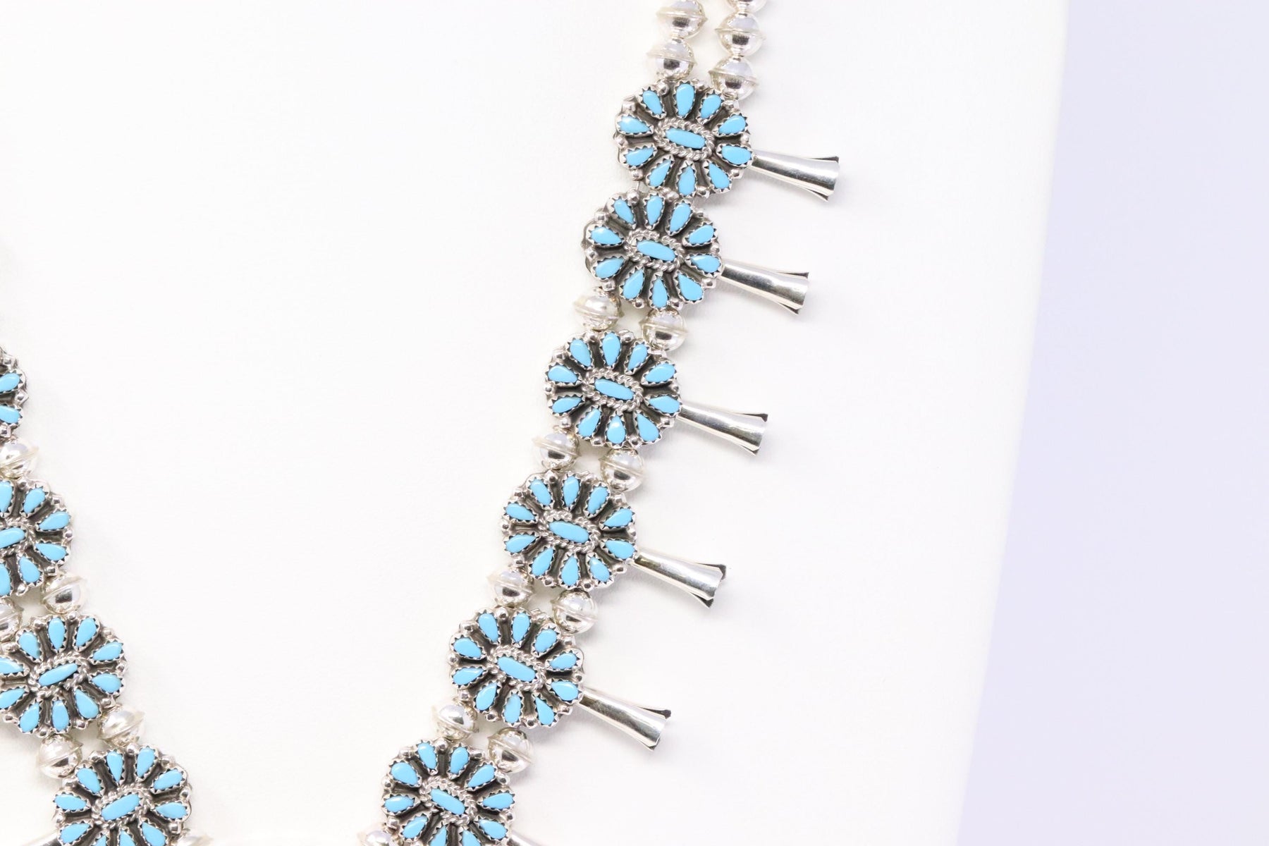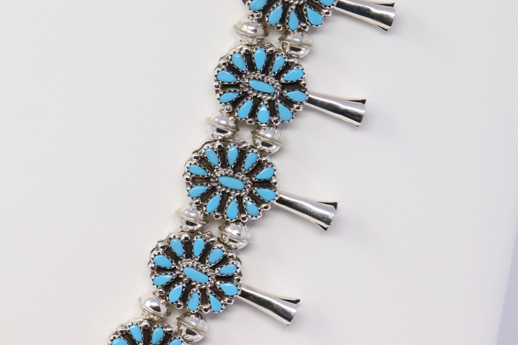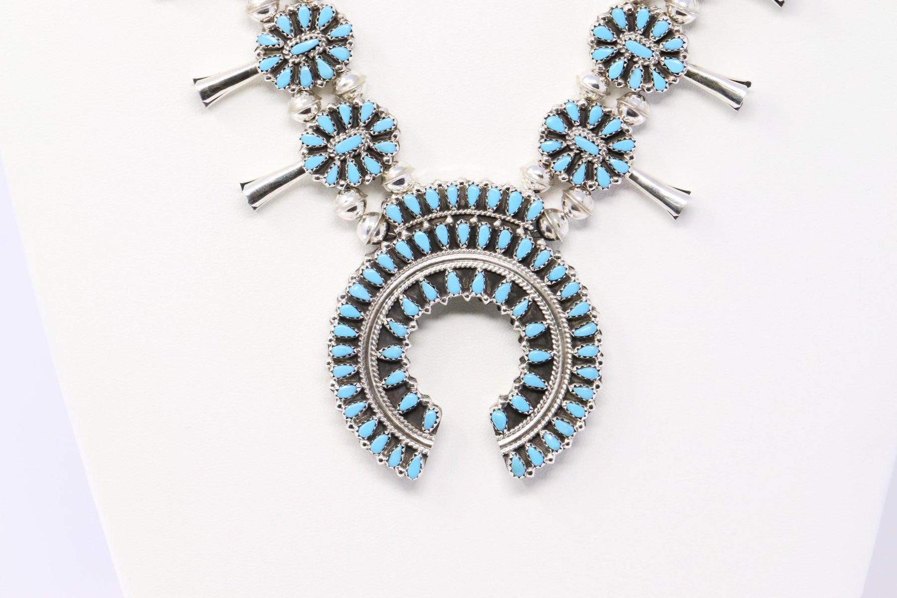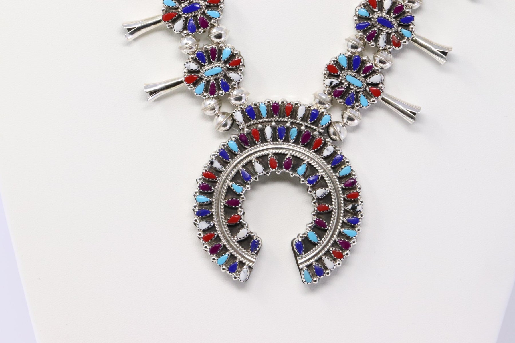 This is a Native American Sterling Silver Turquoise And Multi-Color Reversible Navajo Squash Blossom Necklace Set By Elton James. Squash length is 24.00".