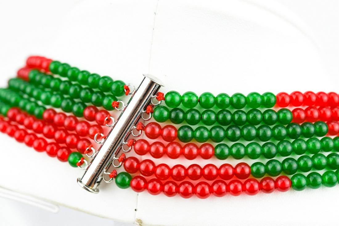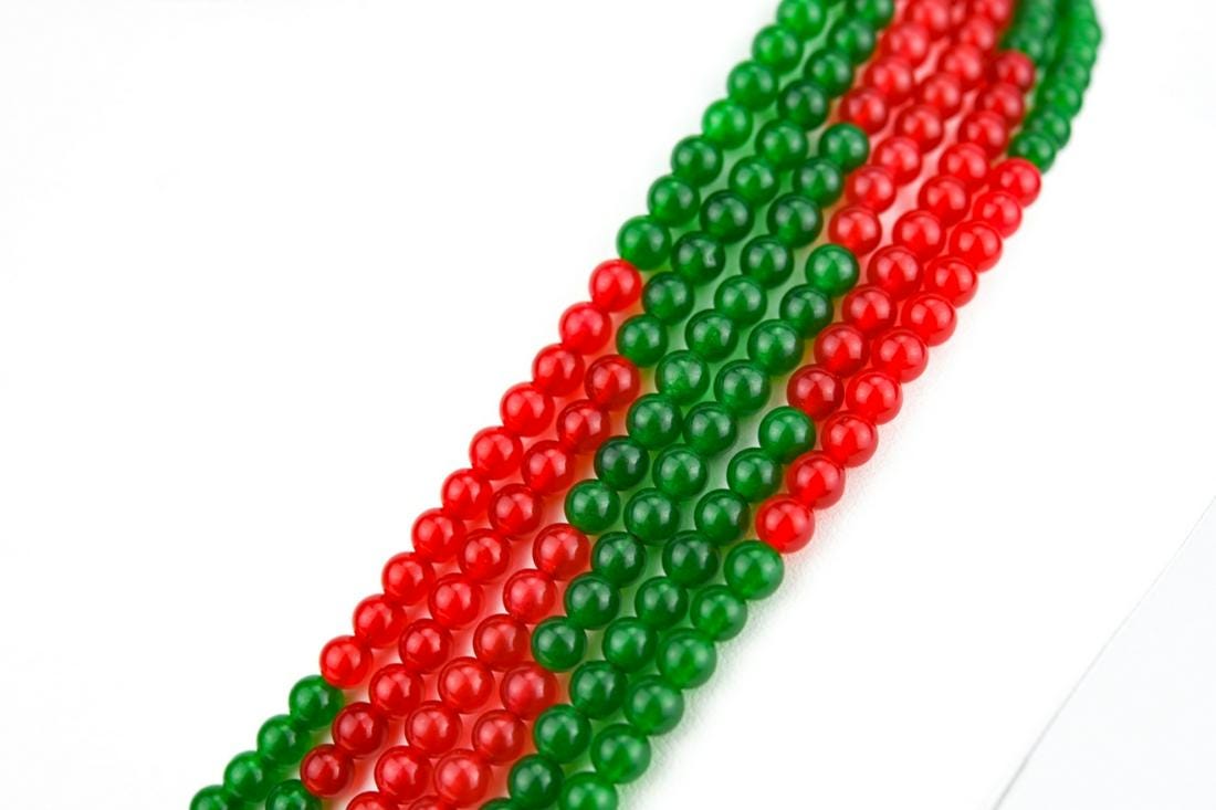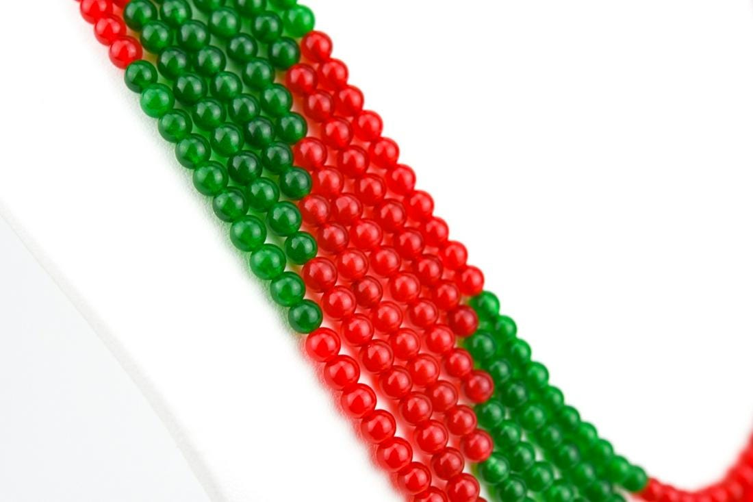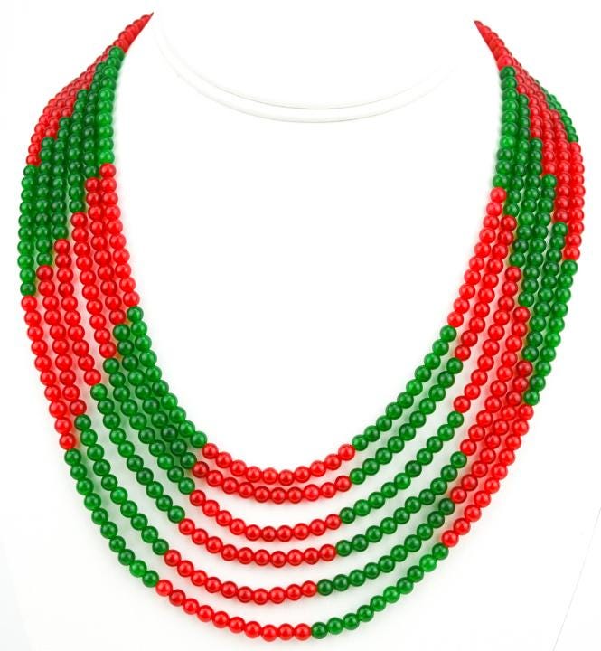 Two tone jade necklace strands in graduated lengths. Longest measures 22 inches. Jade tests as nephrite on the presidium.