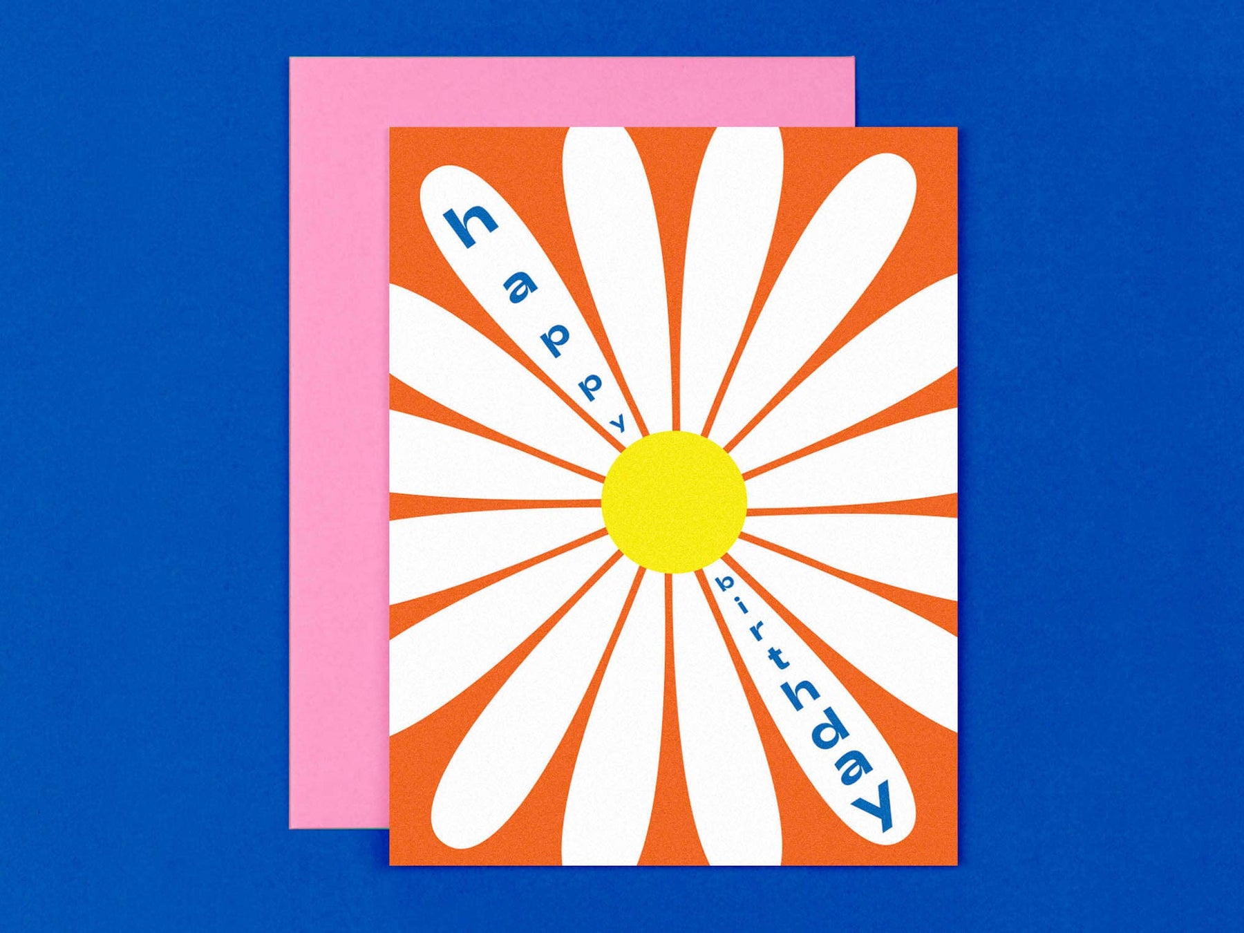 Giant daisy typographic birthday card. • Greeting Card • Blank inside • A2 (4.25" x 5.5") • 100# FSC-certified paper • Comes with a color-coordinated envelope • Packaged in a protective cellophane sleeve • Flat-printed • Printed in the USA