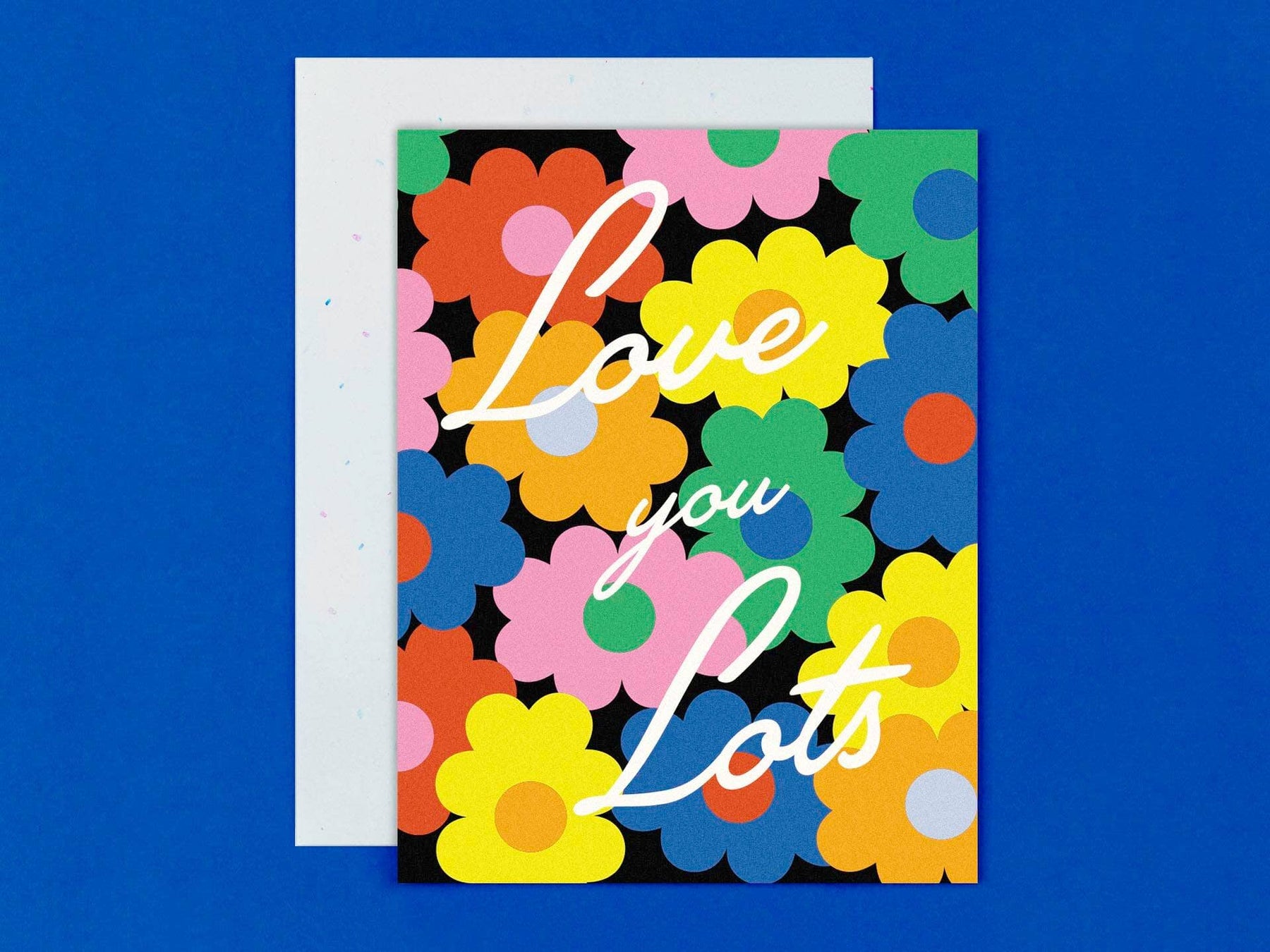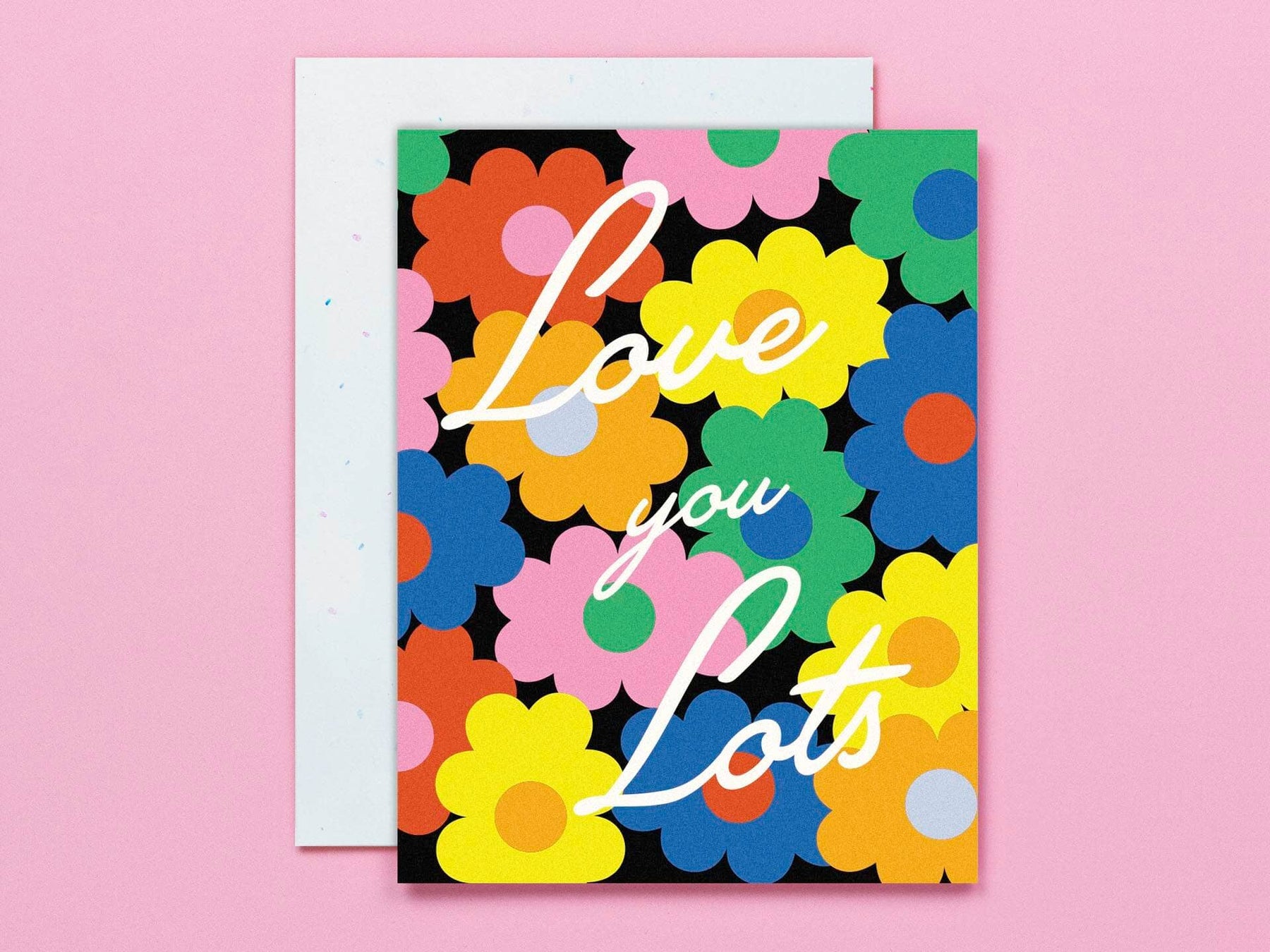 Love You Lots Vaguely pop-art inspired floral love card. Part of Romancing the Fleur, a series vaguely pop-art inspired greeting cards cards that play with mood through scale, color (or lack of color), and texture. It's our first collection to feature script typography as well as a grayscale color palette. Made in USA by @mydarlin_bk. • Greeting Card • Blank inside • A2 (4.25" x 5.5") • 100# FSC-certified paper • Comes with a color-coordinated envelope • Packaged in a protective cellophane sleeve • Flat-printed • Printed in the USA
