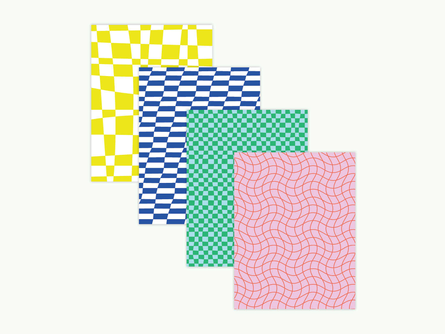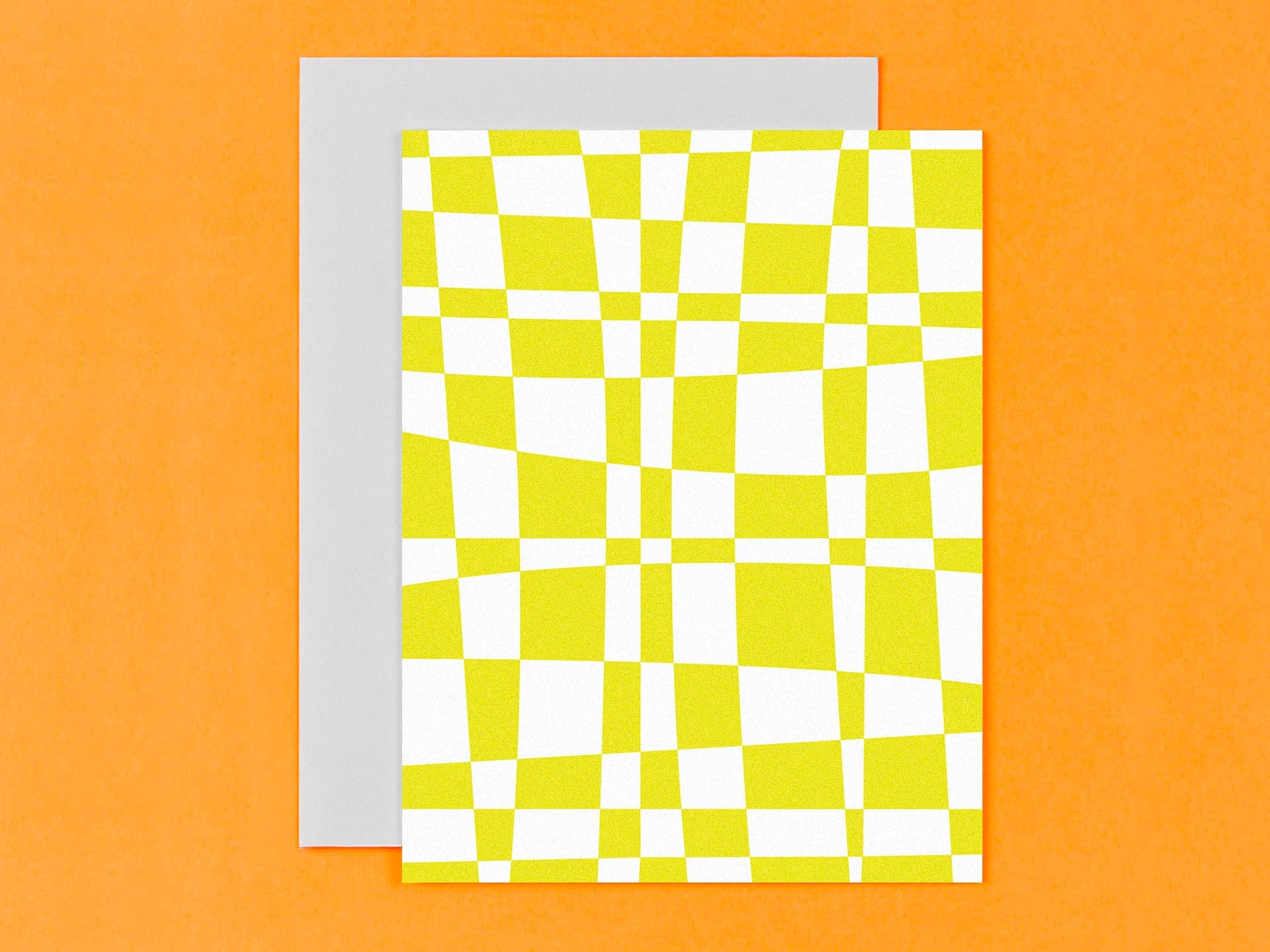 An assortment of checks and grids that bend space and time. • Assorted set of 8 cards with envelopes. (Individual cards available in separate listings.) • 4 designs, 2 of each • Blank inside • A2 (4.25" x 5.5") • 100# FSC-certified paper • Packaged in a clear box. Back of box includes an insert displaying all 4 designs. • Flat-printed • Printed in the USA