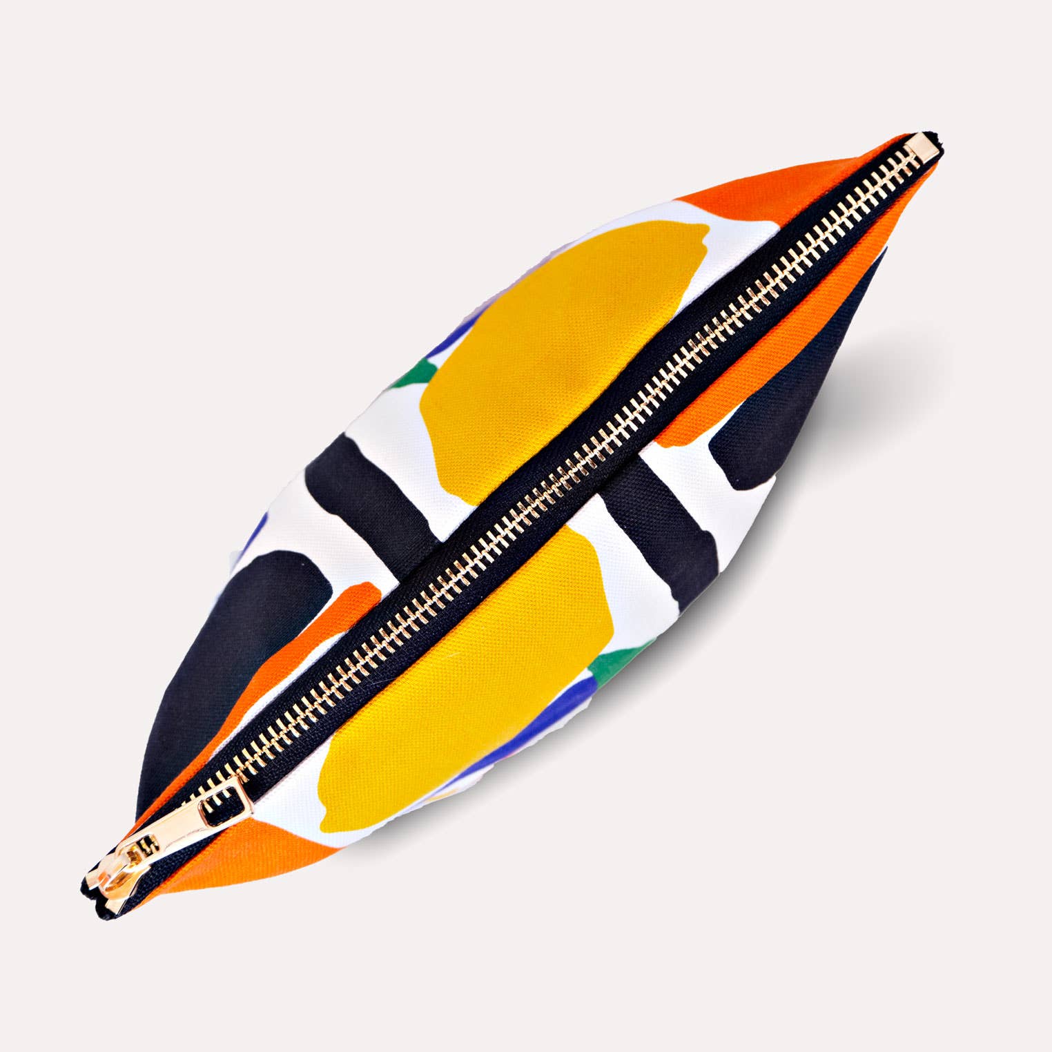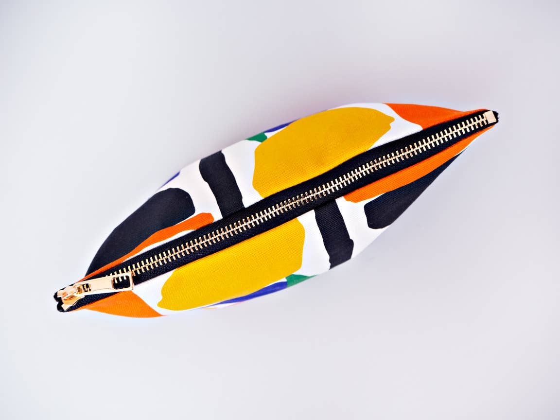 Pencil case or cosmetic pouch? You decide! This is perfect for either, it's made lovely cotton canvas fabric and has nylon lining. Features an abstract print and a contrast colour brass metal zip. Measures 26cms wide at the top, 13cms height and 9.5cms wide at the base. Machine washable as well, so it's easy to look after. Made in the UK.