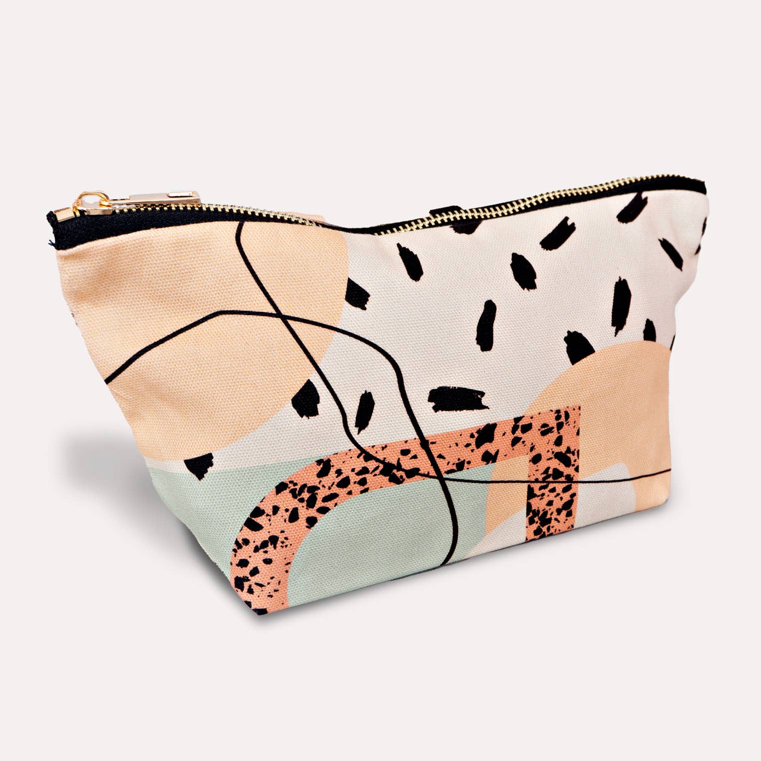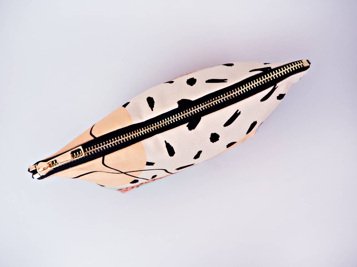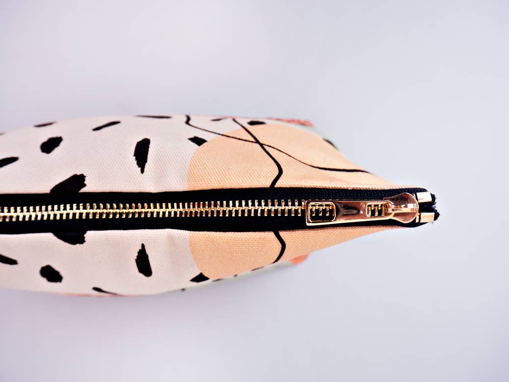 Pencil case or cosmetic pouch? You decide! This is perfect for either, it's made lovely cotton canvas fabric and has nylon lining. Features an abstract print and a contrast colour brass metal zip. Measures 26cms wide at the top, 13cms height and 9.5cms wide at the base. Machine washable as well, so it's easy to look after. Made in the UK.