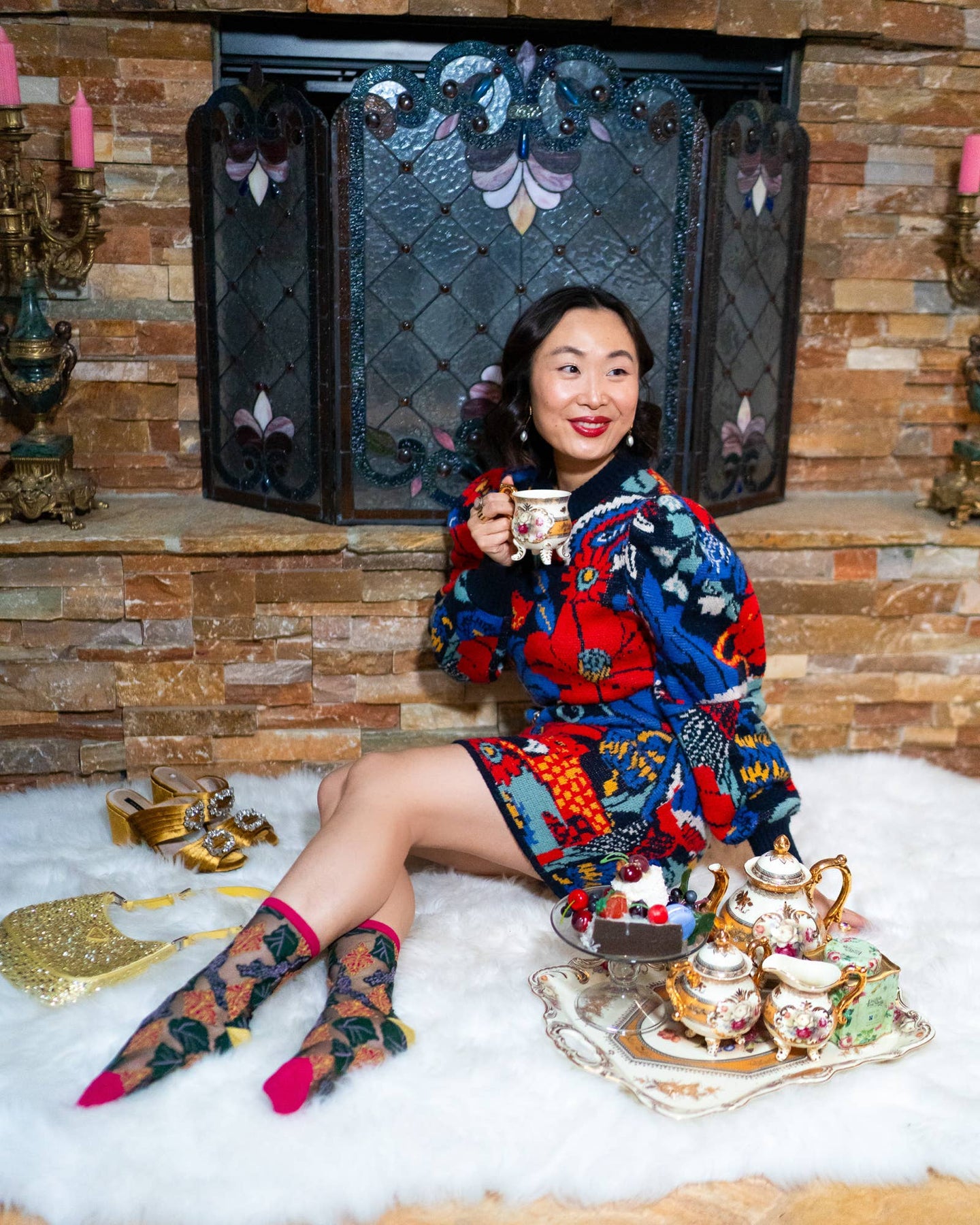 Feel like royalty this holiday season in our decadent brocade jaguar print black sheer sock. An unexpected color combination of purple and green jaguars make this not your typical holiday sock, while the gold shimmer heel still gives your look a festive touch. Finished against black sheer fabric for a sophisticated vibe. One Size. Recommended fit US W5.5-10. 200 Needle Count. ✨ Funky yet elegant - no silly or childish patterns 🧦 Premium quality - durably made with comfortable stretch 👗 Unique - the perfect accessory to add individuality to your outfits